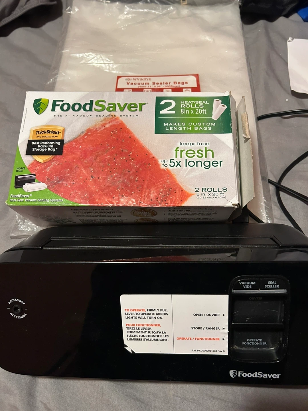 Selling a FoodSaver vacuum sealer! It comes with 2 heat-seal rolls (8in x 20ft) and a pack of vacuum sealer bags (4mil 11" x 16", 100 bags). This is a great way to keep your food fresh up to 5x longer!