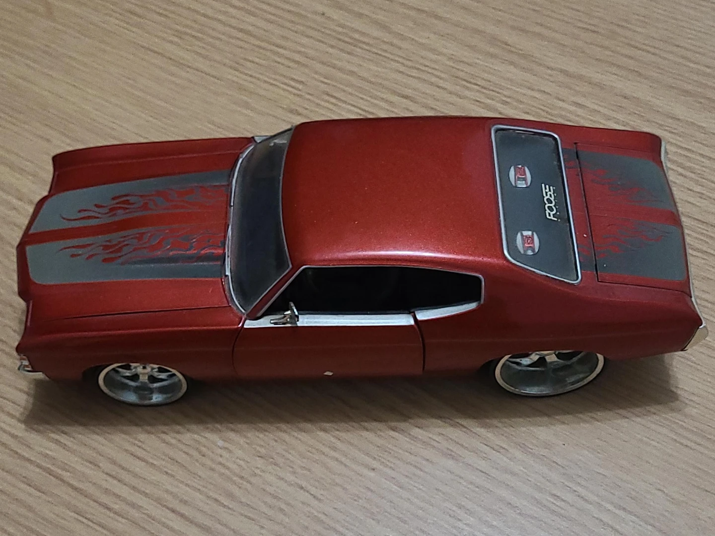 65Selling a Foose '71 Chevelle diecast car. It's a cool red colour with grey stripes and flame designs. The car is in good condition and would make a great addition to any collection!