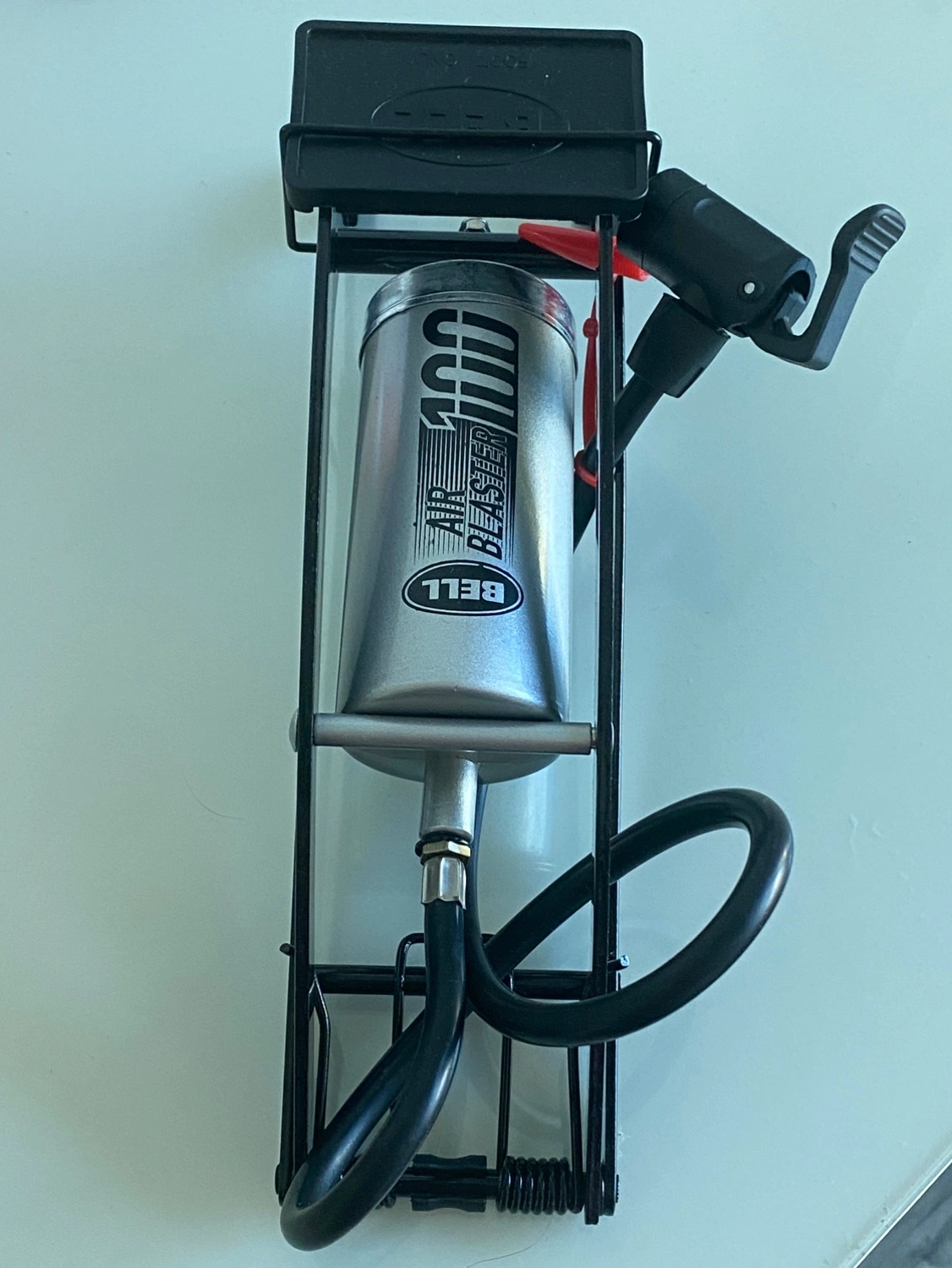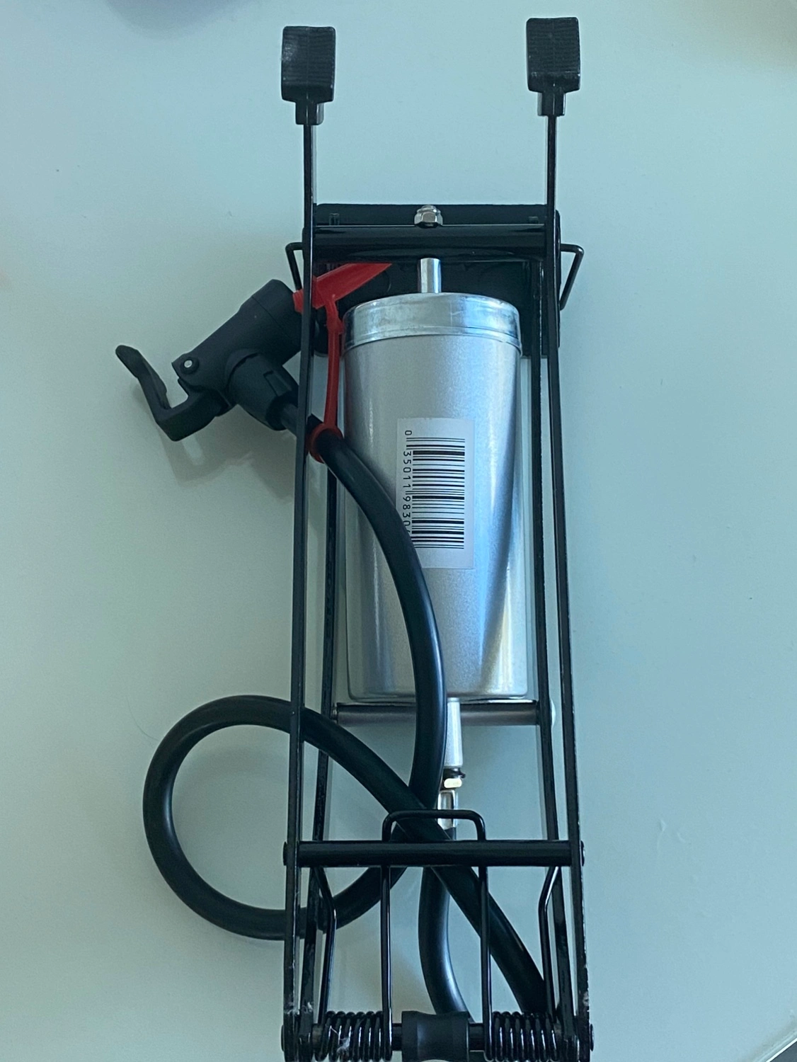 18Foot pump for bicycles. Includes a Presta and Schrader valve head. Includes a hose.