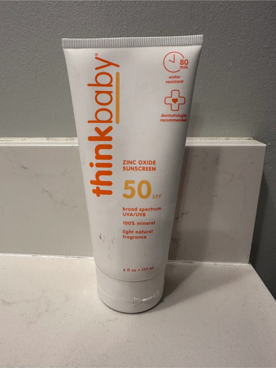 Brand new Thinkbaby SPF 50 sunscreen, 177ml. Broad spectrum UVA/UVB protection. Water resistant for 80 minutes. Free of harmful chemicals and non-nano zinc oxide particles. Reef friendly and EWG rated. Expiry April 2027.
