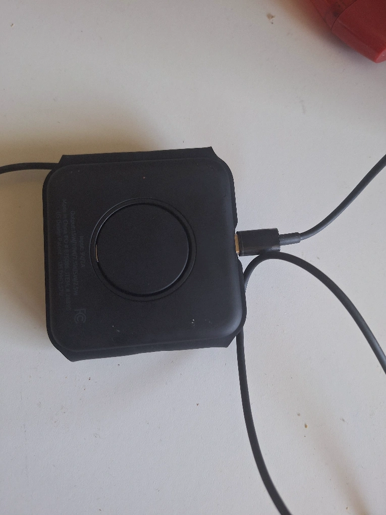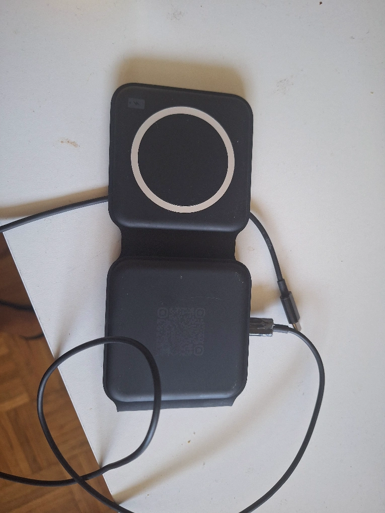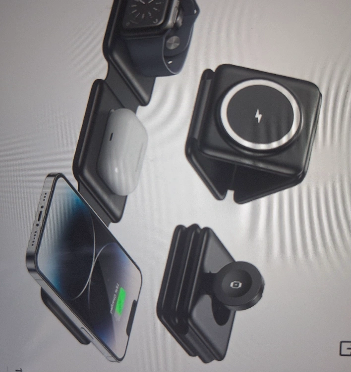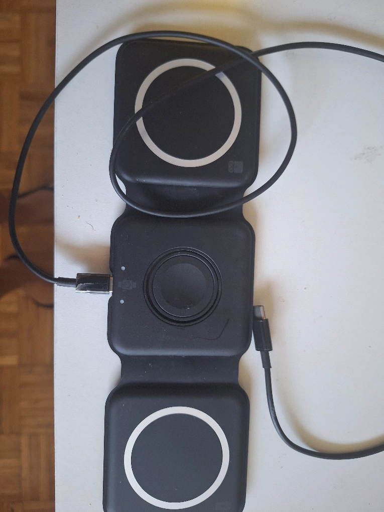 Selling a 3-in-1 foldable wireless charger in black. It's in great condition and perfect for charging your apple phone, earbuds, and smartwatch all at once! It's lightweight and portable, making it easy to take with you on the go. never used. pick up deerpark crescent st clair