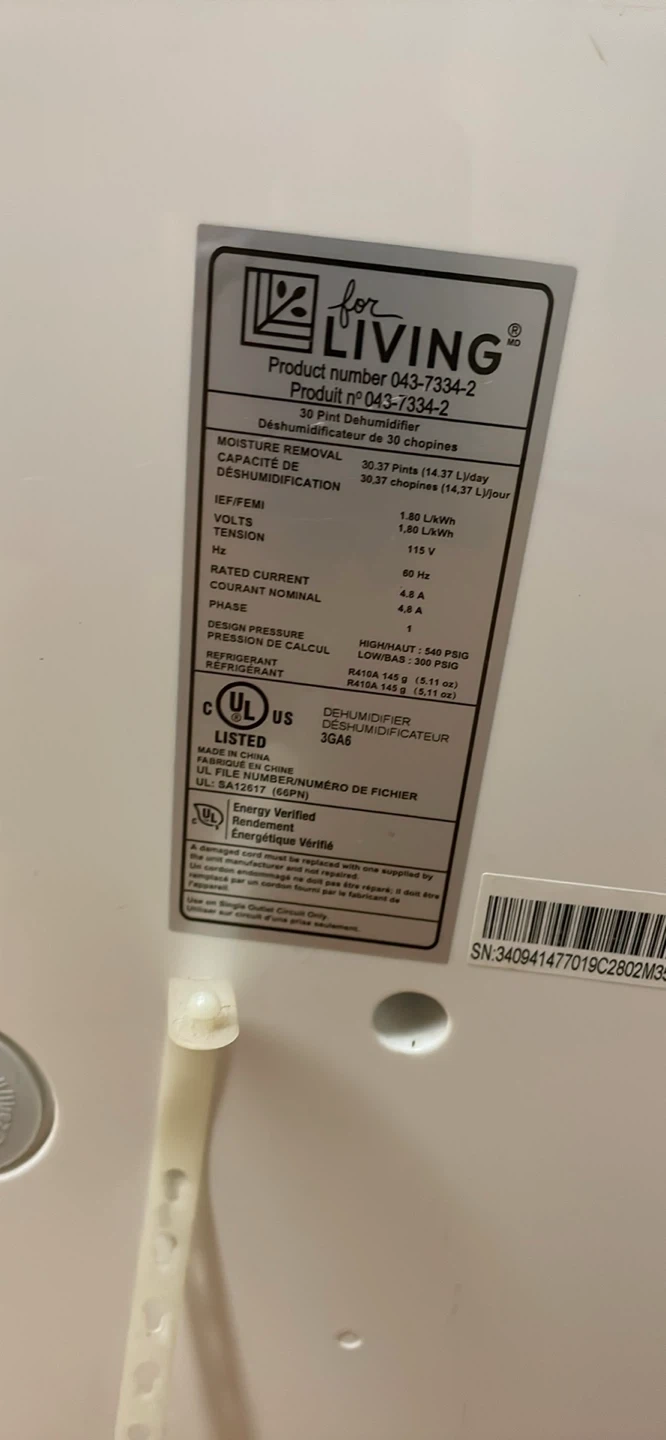 65Selling a For Living 30-pint dehumidifier. It removes 30.37 pints (14.37 L) of moisture per day. It runs on 115 V and 4.8 A. Great for keeping your home dry and comfortable! DEHUMIDIFIER. EXCELLENT WORKING CONDITION. WHITE. FOR LIVING BRAND BOUGHT AT C/TIRE.
