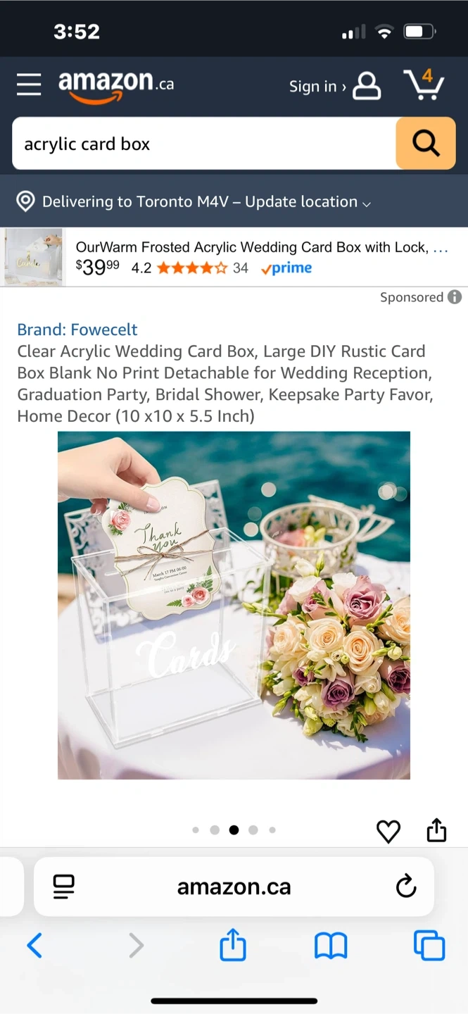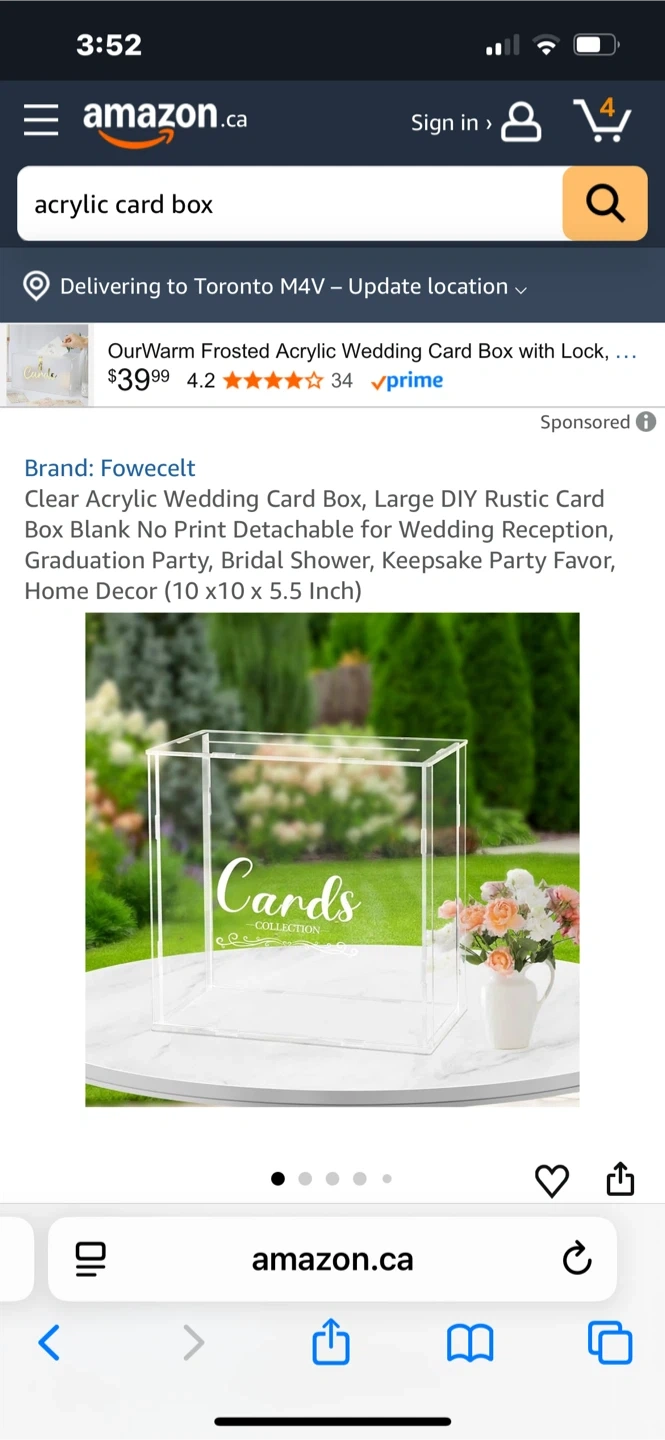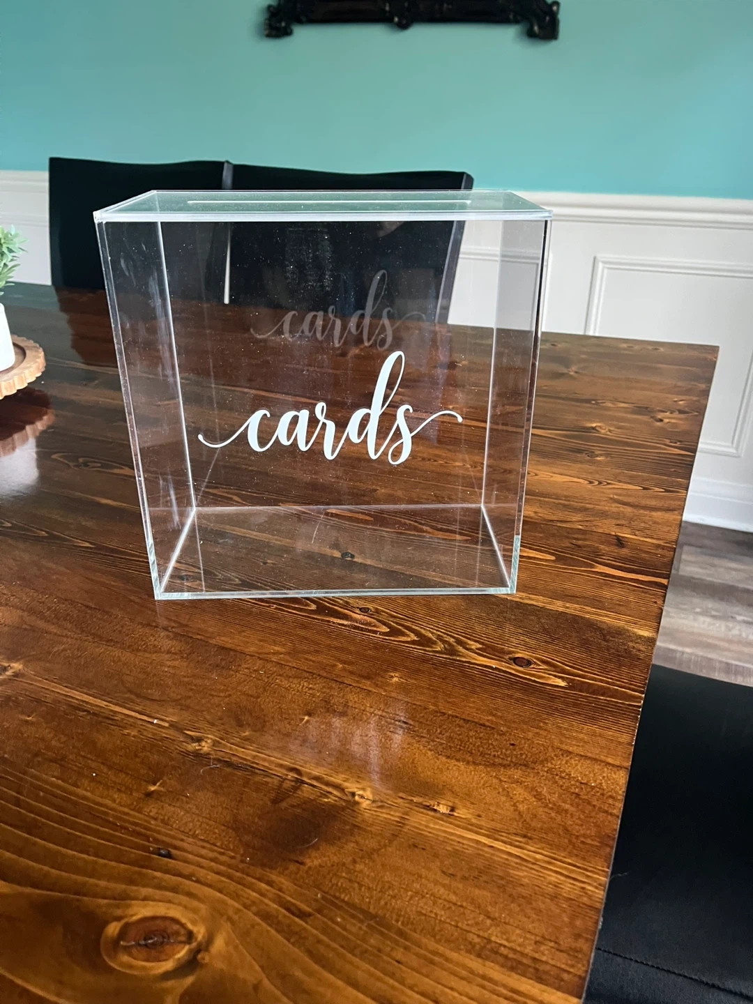 26For Rent a clear acrylic wedding card box. $15.00 for 24 hours plus a $10.00 returnable deposit, given back when item returned. It's in great shape and ready to collect cards at your special event! The box has a slot for cards and a simple, elegant design with "cards" written on the side. Dimensions are approximately 10 x 10 x 5.5 inches.