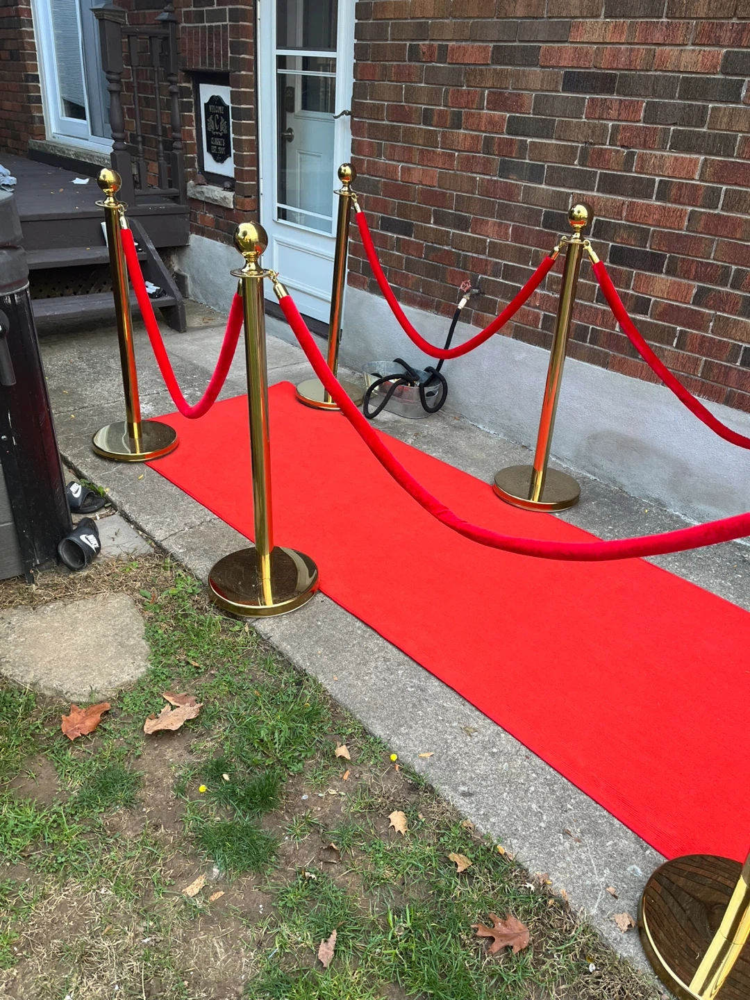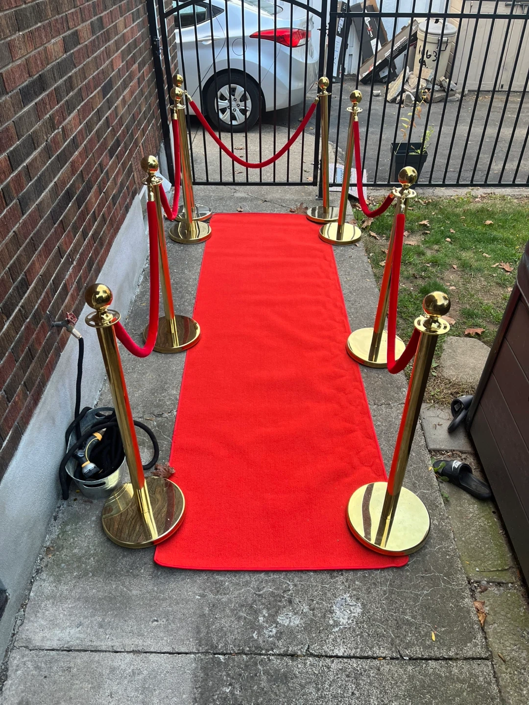 For rent a 10’ red carpet with gold stanchions. Perfect for adding a touch of glamour to any event or space! The carpet is a vibrant red and the stanchions are a shiny gold colour. $60.00 for 24 , plus $50 refundable deposit.