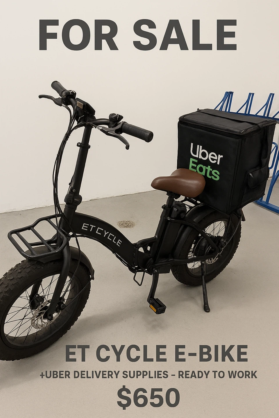 65🚲 Looking to sell my ET Cycle e-bike, perfect for daily commuting or Uber Eats/Skip deliveries. The bike is in great working condition and comes with all Uber delivery supplies, making it ready for work from day one. ✅ Bike Details: • Brand: ET Cycle • Type: Folding Electric Fat Bike • Motor: Powerful rear hub motor • Battery: Long-lasting removable battery (locks securely in frame) • Tires: Fat tires for all-season riding • Brakes: Disc brakes (front & rear) • Extras Included: • Front cargo rack • Heavy-duty fenders • Phone mount • Strong kickstand • Condition: Used but well-maintained. Runs smooth, battery charges well, and everything works properly. 🔥 Bonus – Included with the Bike: ✔️ Uber delivery insulated bag ✔️ Phone holder ✔️ All delivery accessories you need to start working immediately Perfect for students, delivery riders, or city commuting. 💲 Price: $650 Location: Toronto, downtown A great deal for an electric bike with this setup and extras included. 📞 Contact: Message me if interested or want to come test the bike.