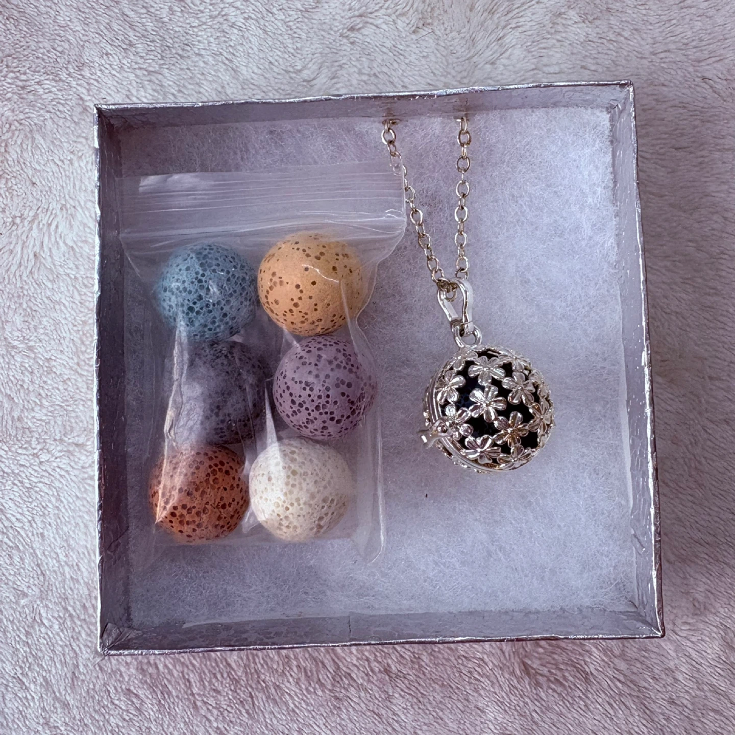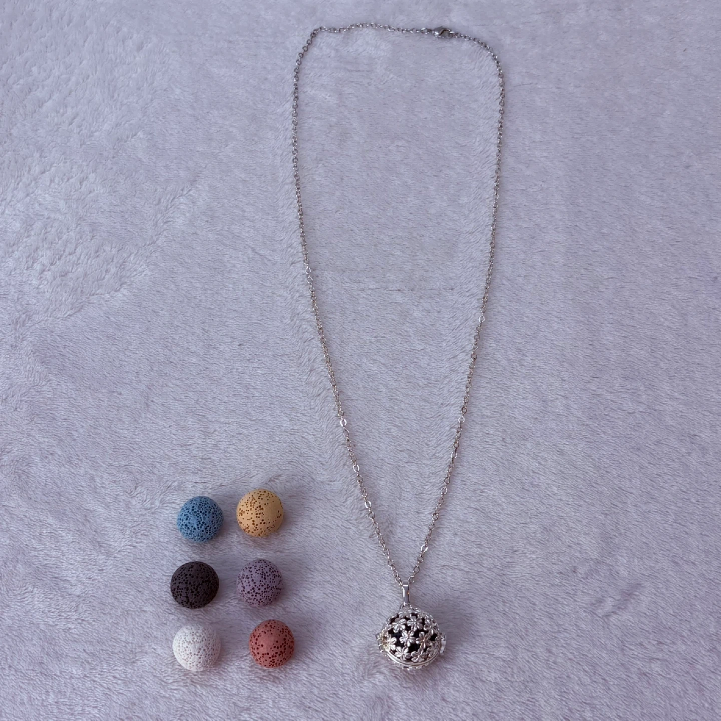 This beautiful aromatherapy necklace features an intricate silver-tone floral patterned locket designed to hold porous lava stones for diffusing your favorite essential oils. It includes seven interchangeable lava stones in a variety of colors to match any outfit, allowing you to carry a soothing scent with you throughout the day.
