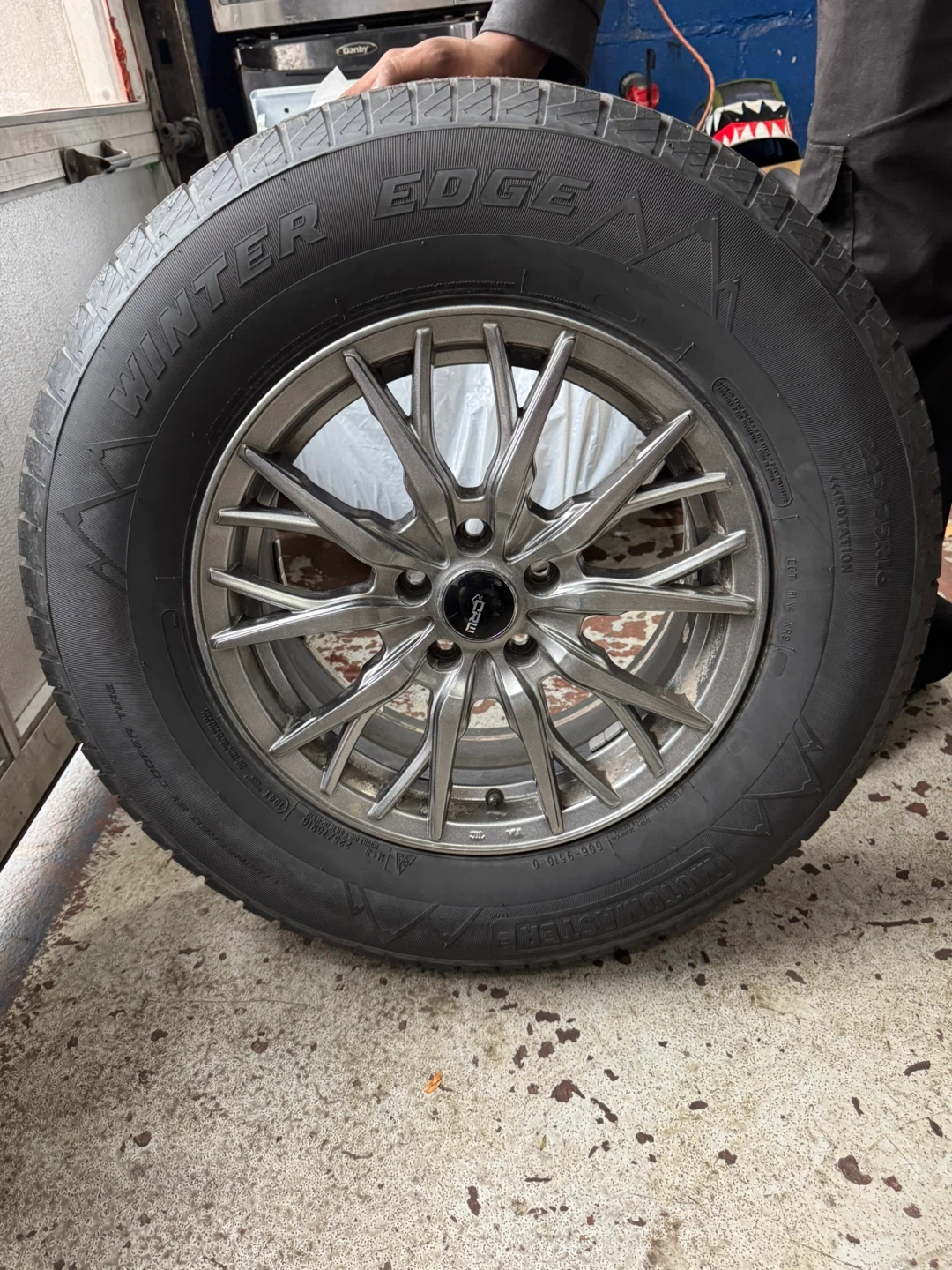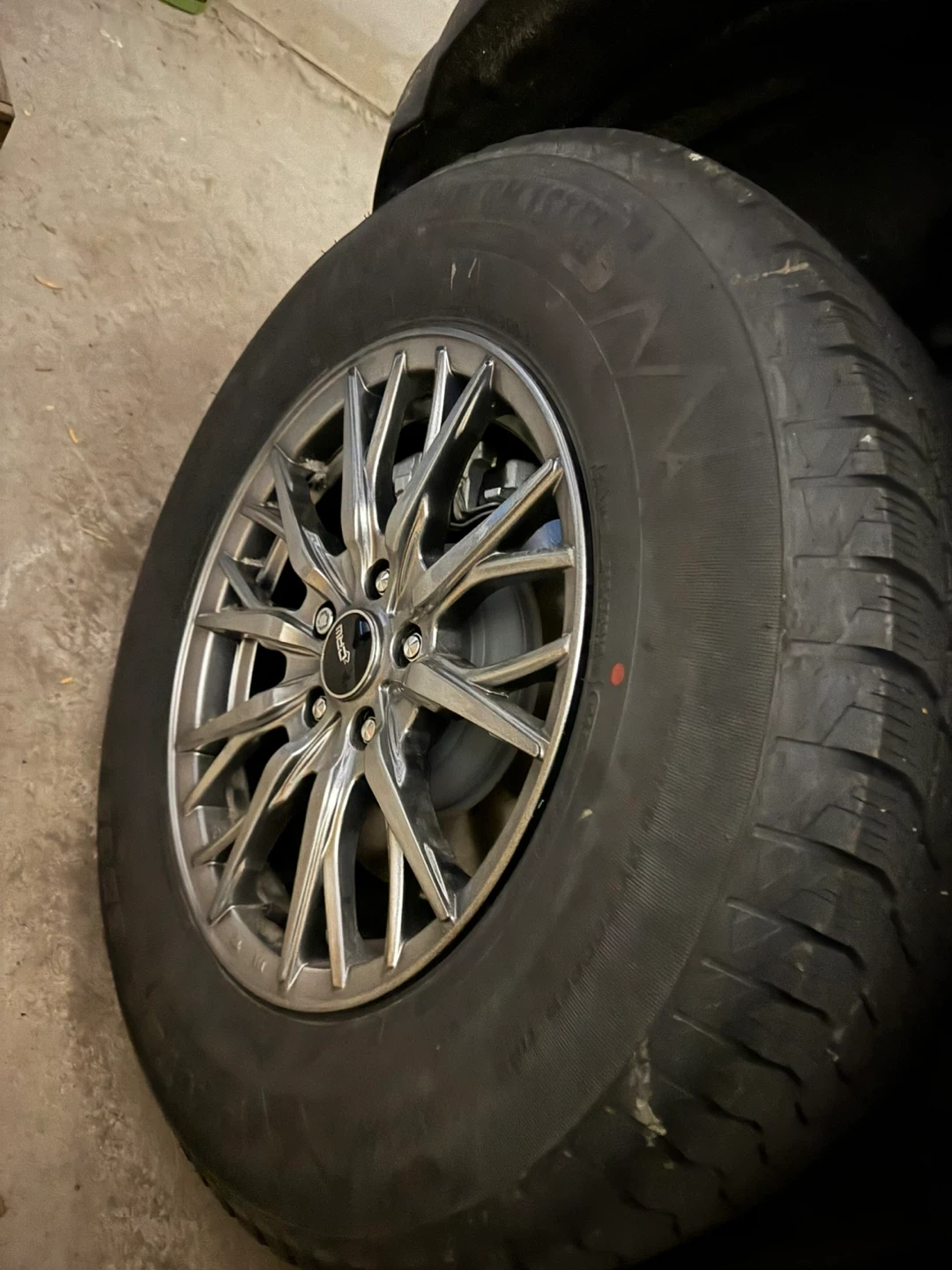 28Winter tire set on alloy rims taken off ford Bronco sport- The winter tires have 1-2 more seasons on them they are MotoMaster Winteredge made by cooper tires. Rims are in excellent conditions and are balanced and ready to mount. Size is 225/75R/16- I had sized down for winter tire set.