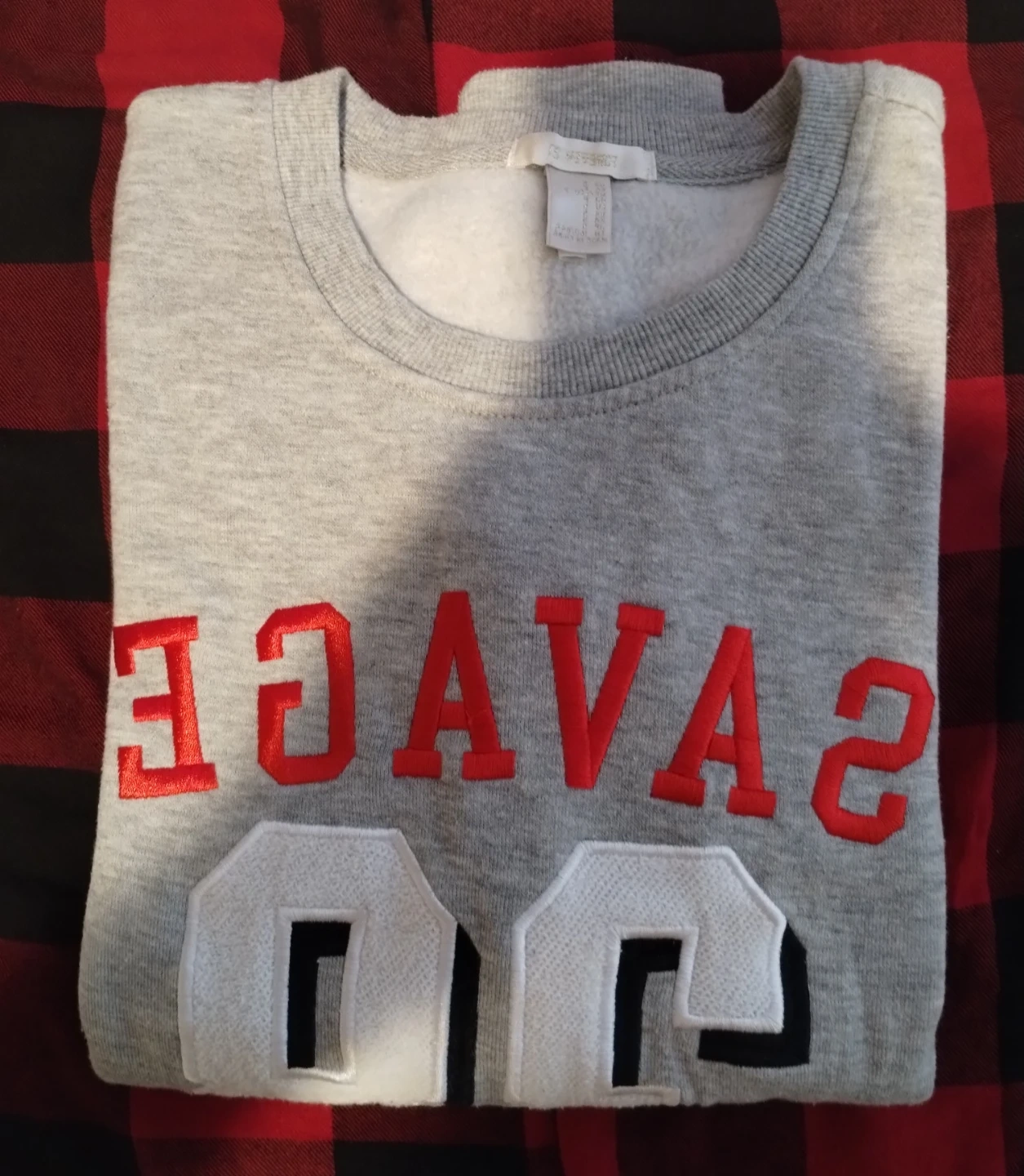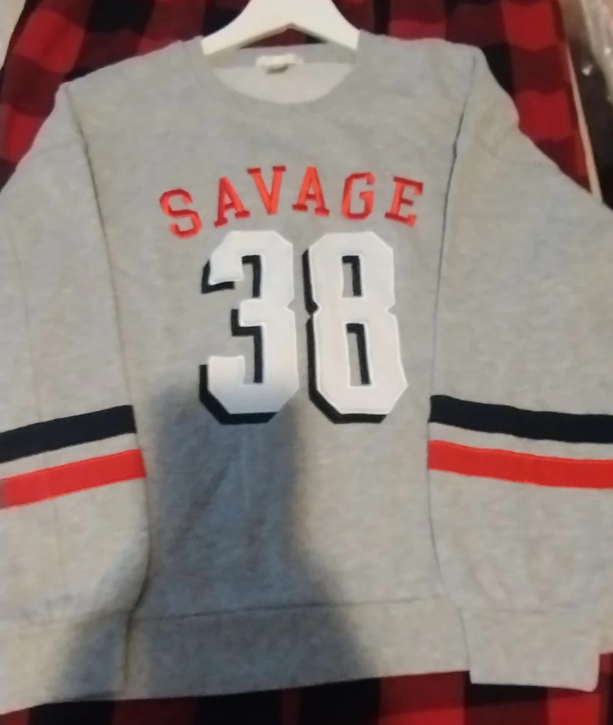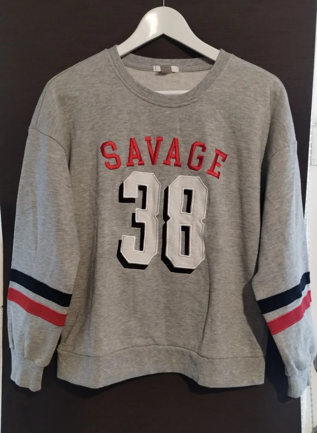 58Selling a Forever 21 grey sweatshirt with the word "Savage" and the number 38 on it. It's a size small and has red and black stripes on the sleeves. Perfect for a casual look! PU LAKESHORE AND MIMICO