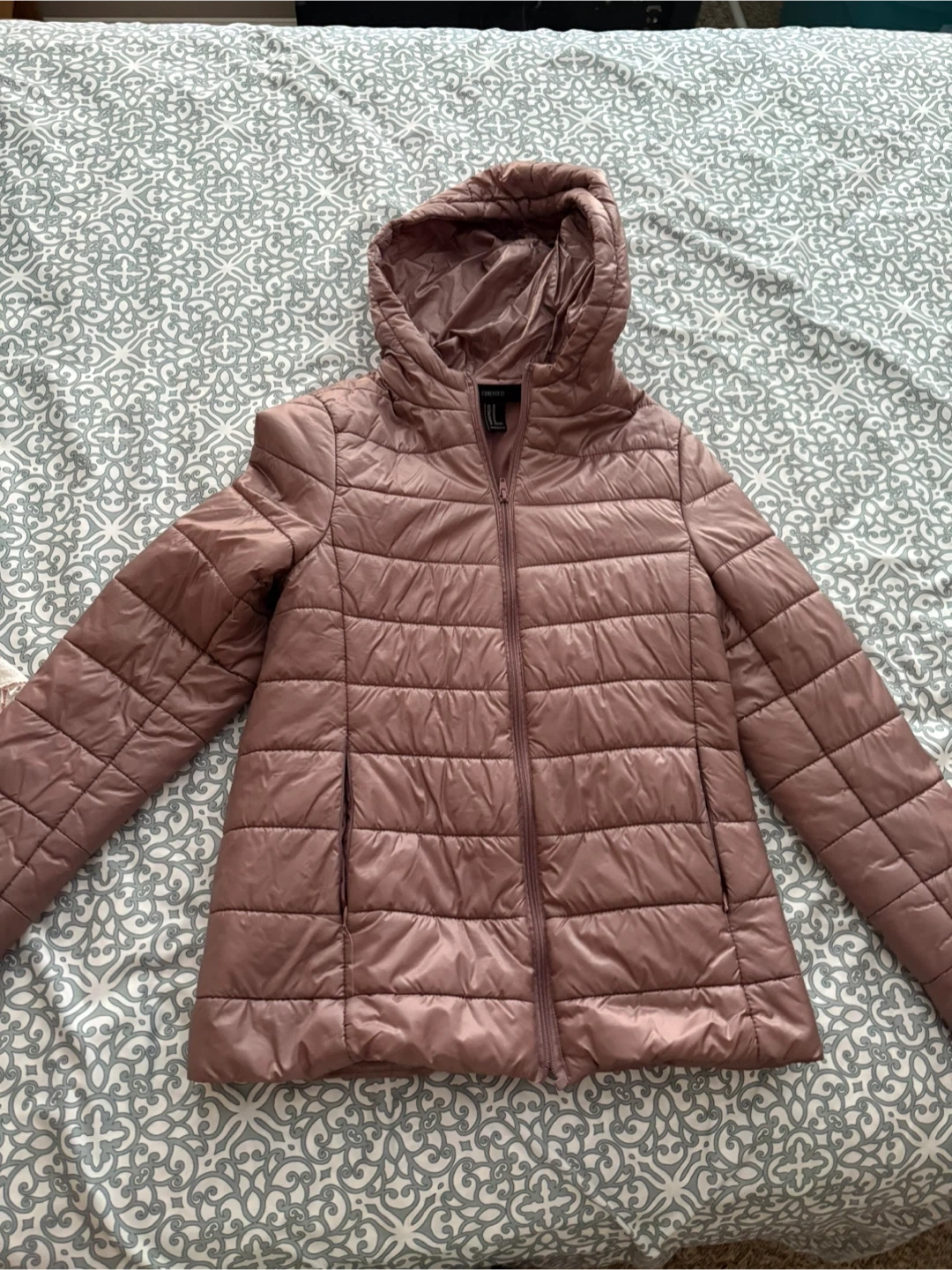 70Selling a Forever 21 puffer jacket in a lovely mauve colour. It's a size medium and in great condition. Perfect for staying warm and stylish!