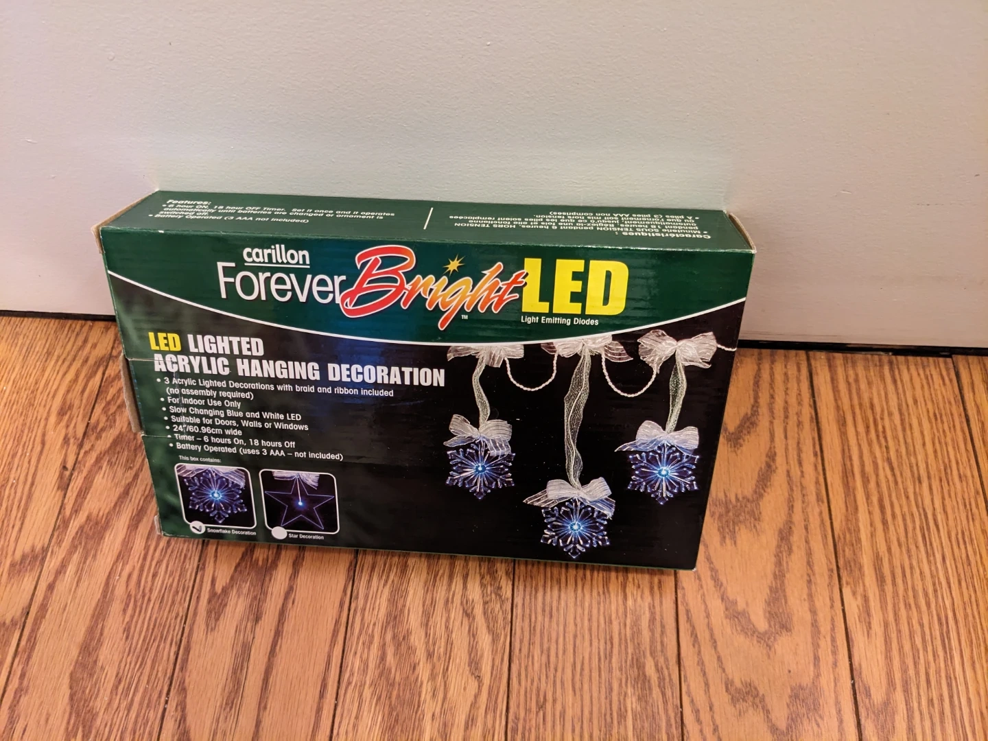 534Selling a brand new Forever Bright LED lighted acrylic hanging decoration, still in its original box! It features 3 acrylic lighted decorations with braid and ribbon included. You can set it for 6 hours on and 18 hours off. It operates on 3 AAA batteries (not included). Perfect for adding a festive touch to doors, walls, or windows!