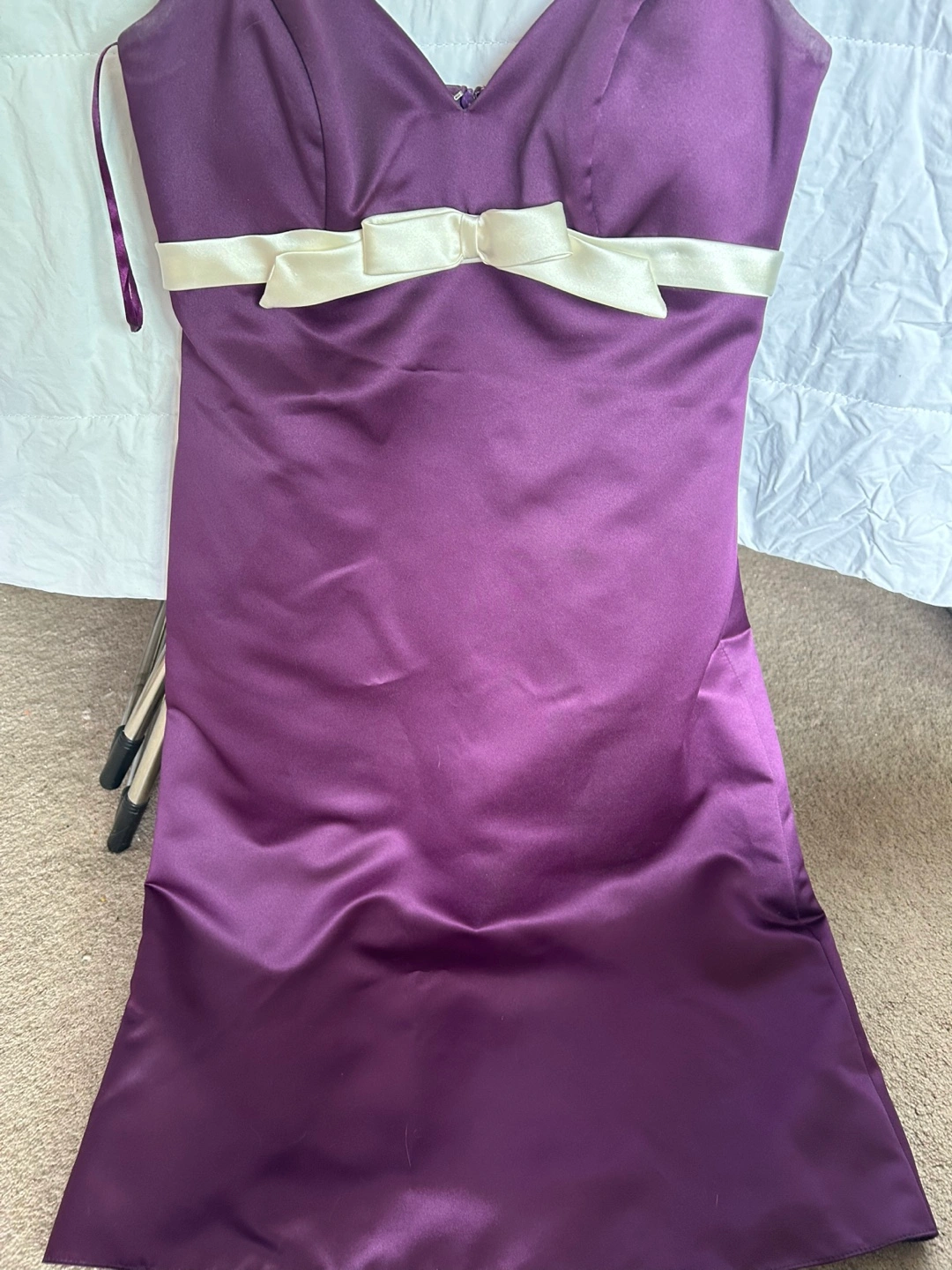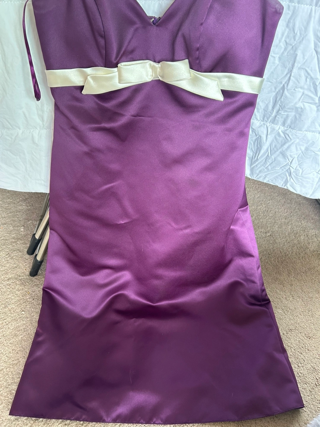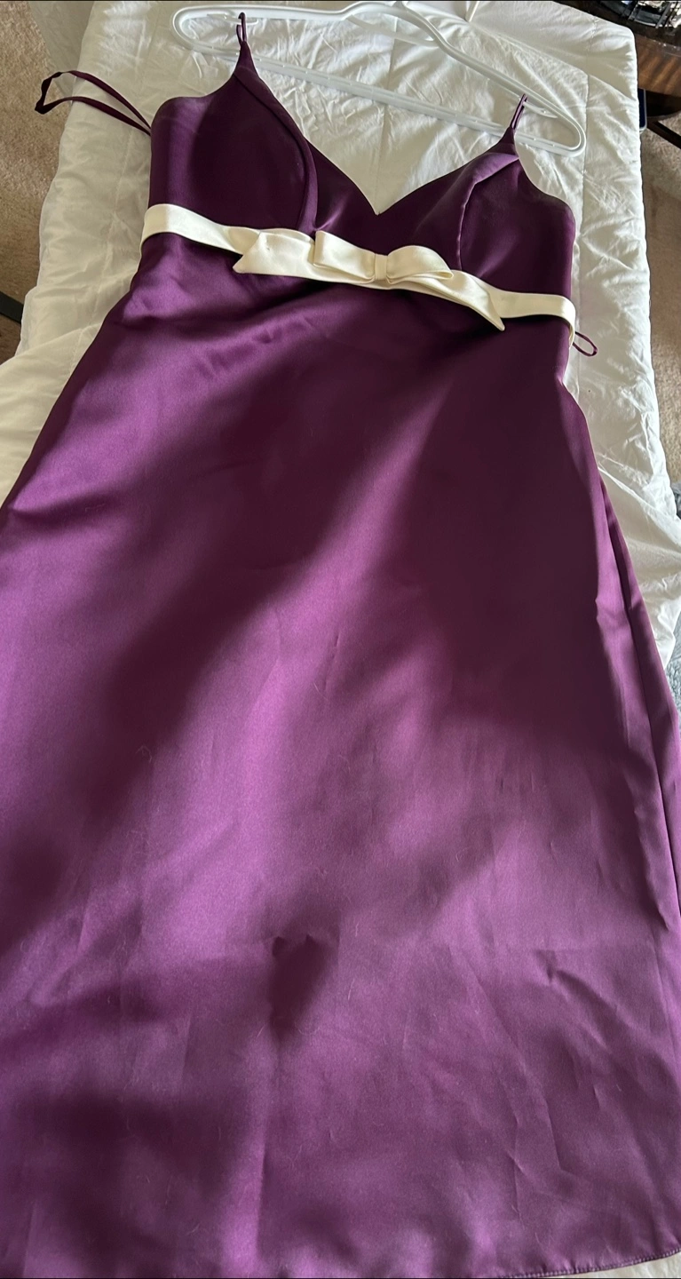 dark plum dress with beautiful ivory bow. V neck. Mid calf / below the knee length. Worn once as a bridesmaid. Da Vinci brand, size 12. (5’3, 130 pounds when worn). Cups are sewn in, can easily be removed. $60 obo. Smoke free, bug free home. Pet friendly.