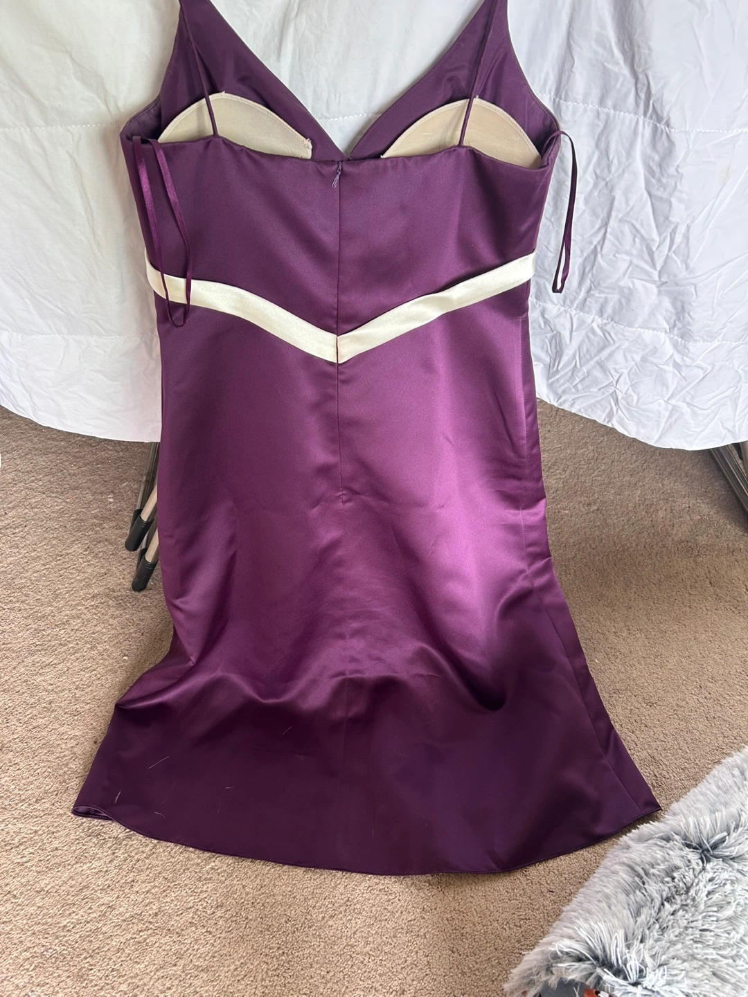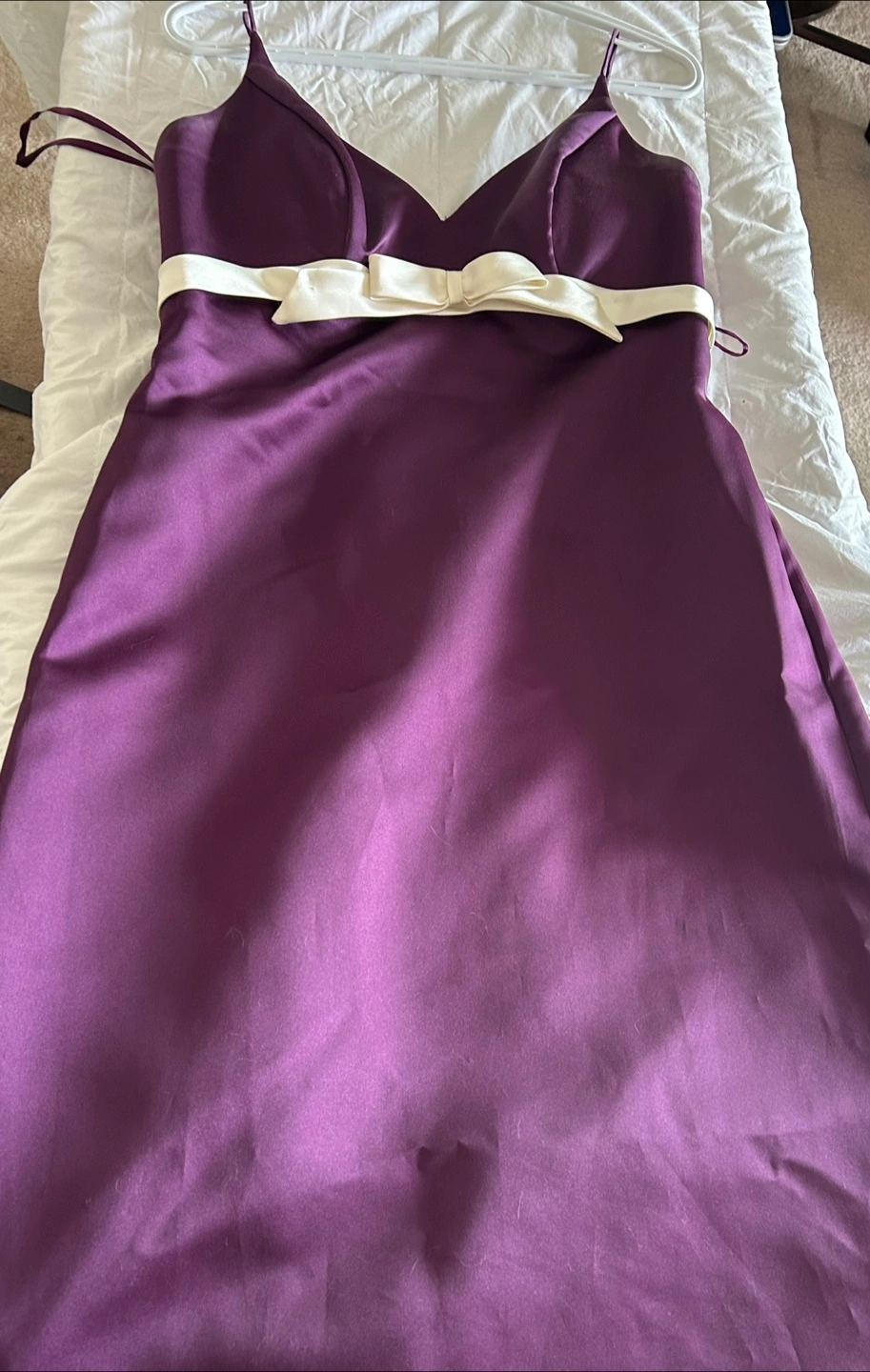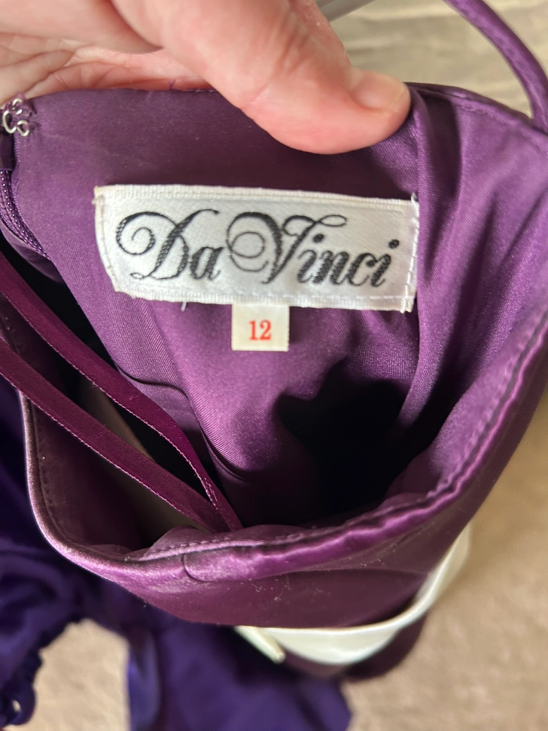 dark plum dress with beautiful ivory bow. V neck. Mid calf / below the knee length. Worn once as a bridesmaid. Da Vinci brand, size 12. (5’3, 130 pounds when worn). Cups are sewn in, can easily be removed. $60 obo. Smoke free, bug free home. Pet friendly.