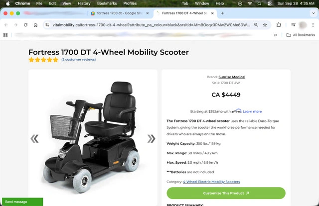 Fortress 1700 DT 4-Wheel Scooter purchased new in Nov 2021 and only used 2 times. Scooter is essentially brand new with batteries replaced in September 2025. Additional accessories include: - Flag mount w/flag - Cell phone holder - Front basket - Side view mirror - Cup holder Open to reasonable offers.