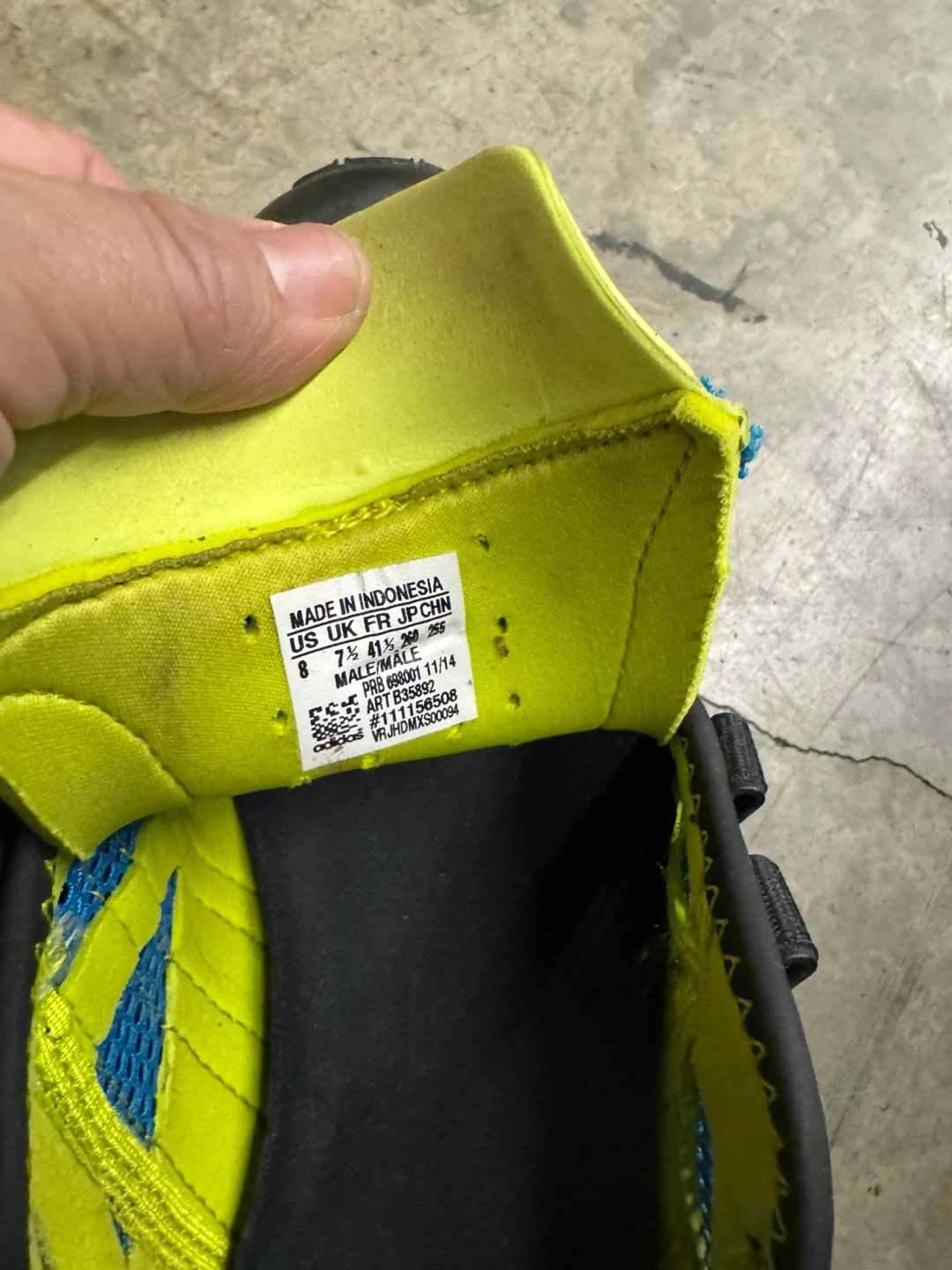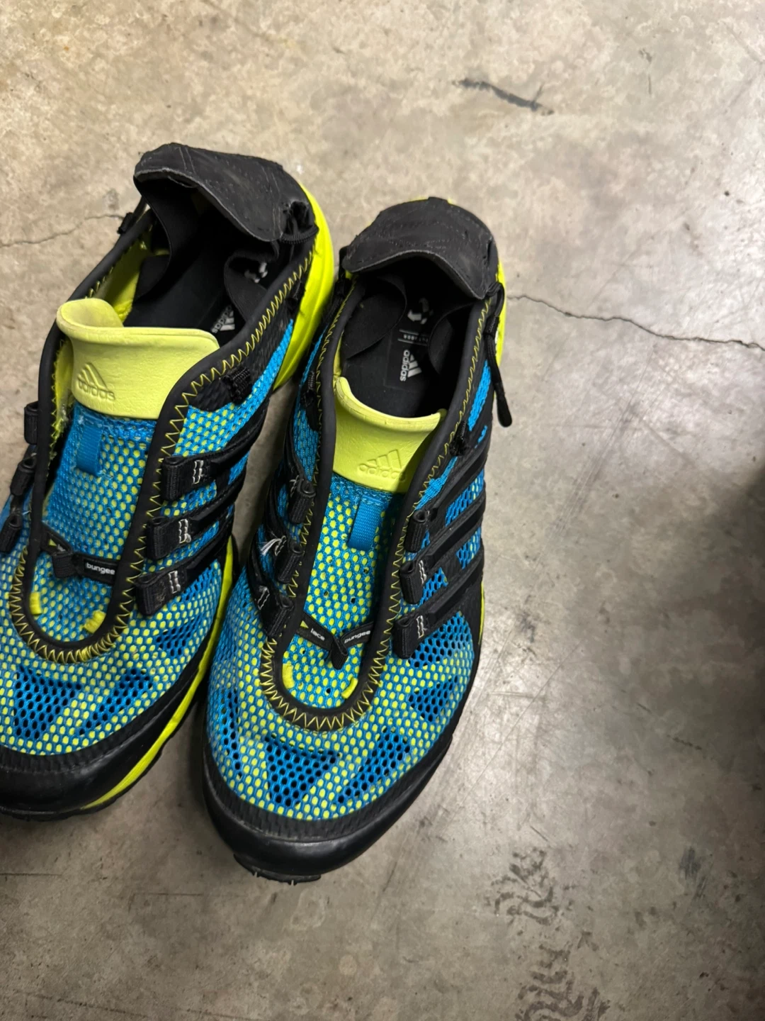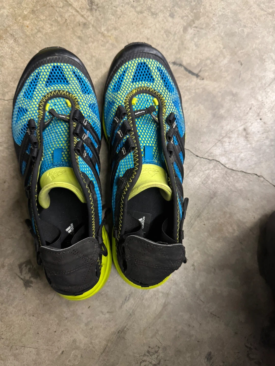 Adidas Hydroterra Shandal water shoes in size 8. These are great for outdoor activities near water. They have a blue and black design with yellow accents. Perfect for hiking or water sports!