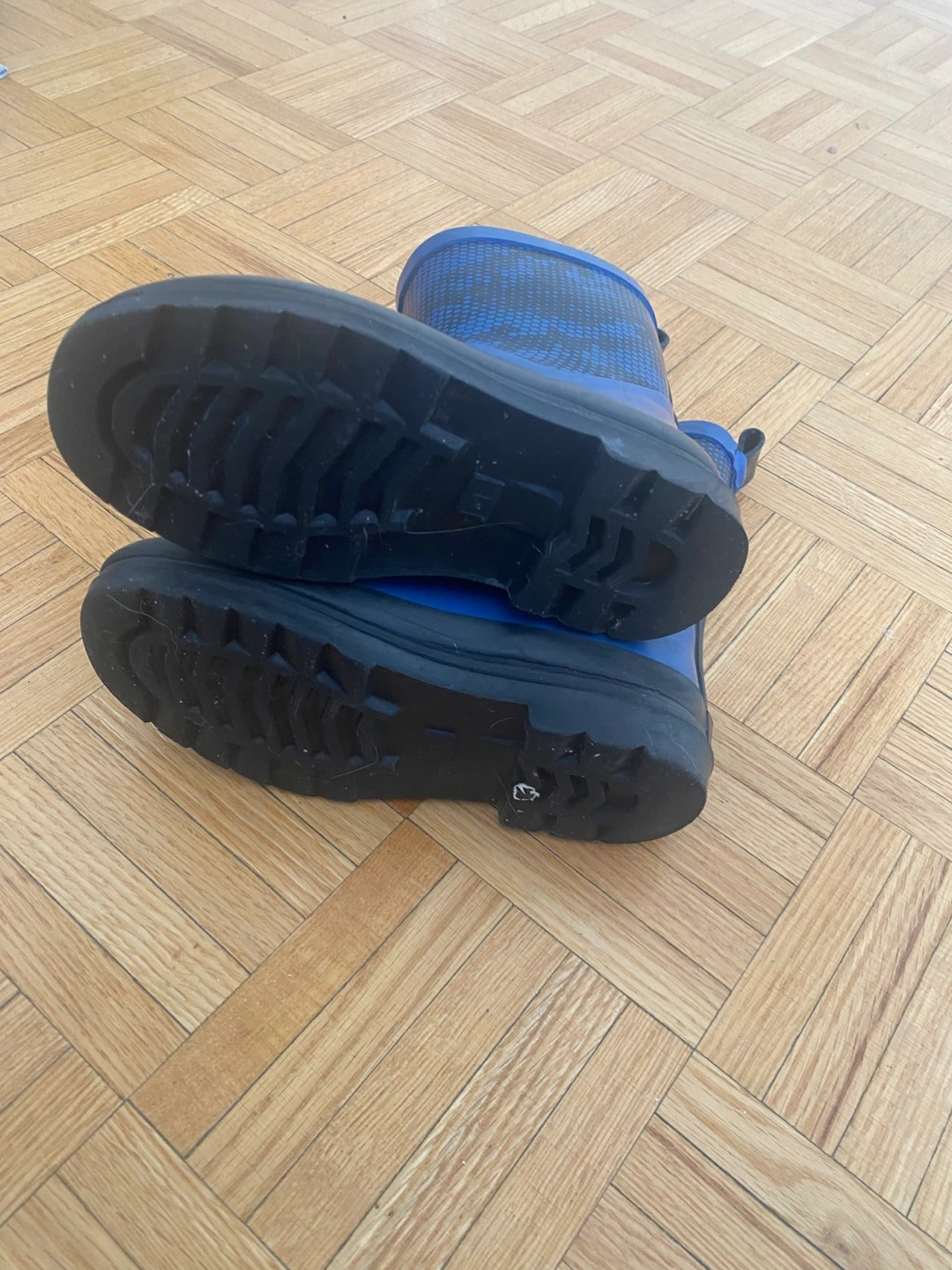 These blue rain boots are from Ripzone. They feature a fun, patterned design on the upper calf. The soles are black and textured for grip. Great for keeping feet dry on wet days. Size 1 us