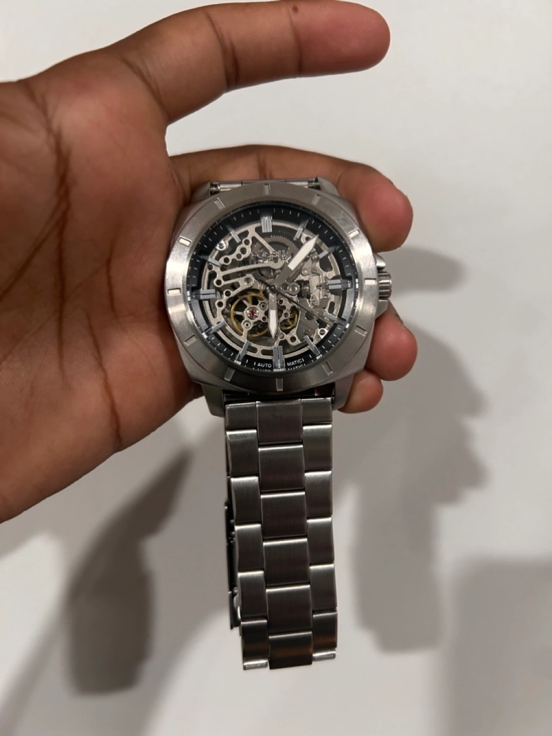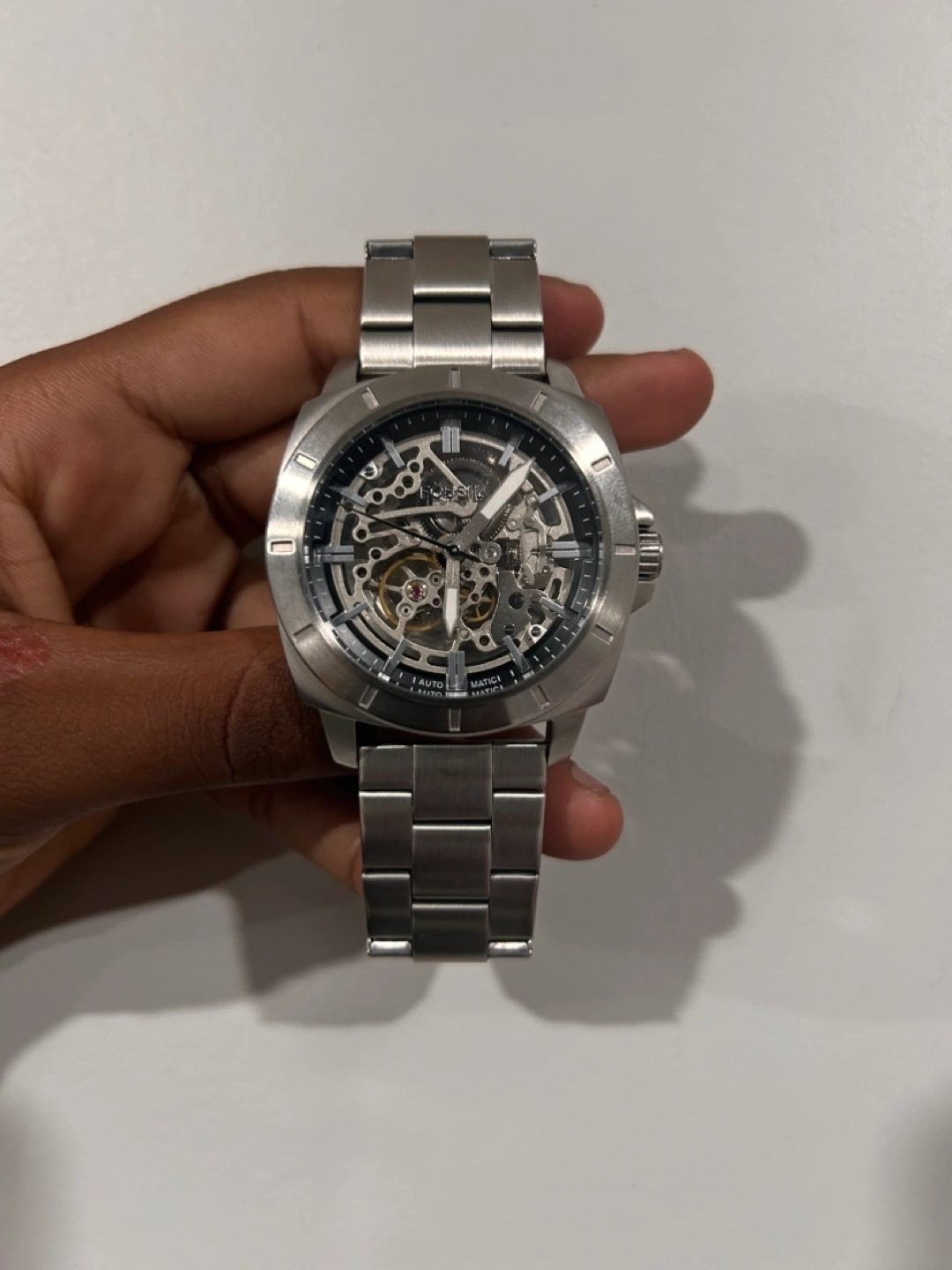 Selling a Fossil automatic watch in silver! It's in great shape and features a cool skeleton dial that lets you see the inner workings. A stylish and eye-catching timepiece!