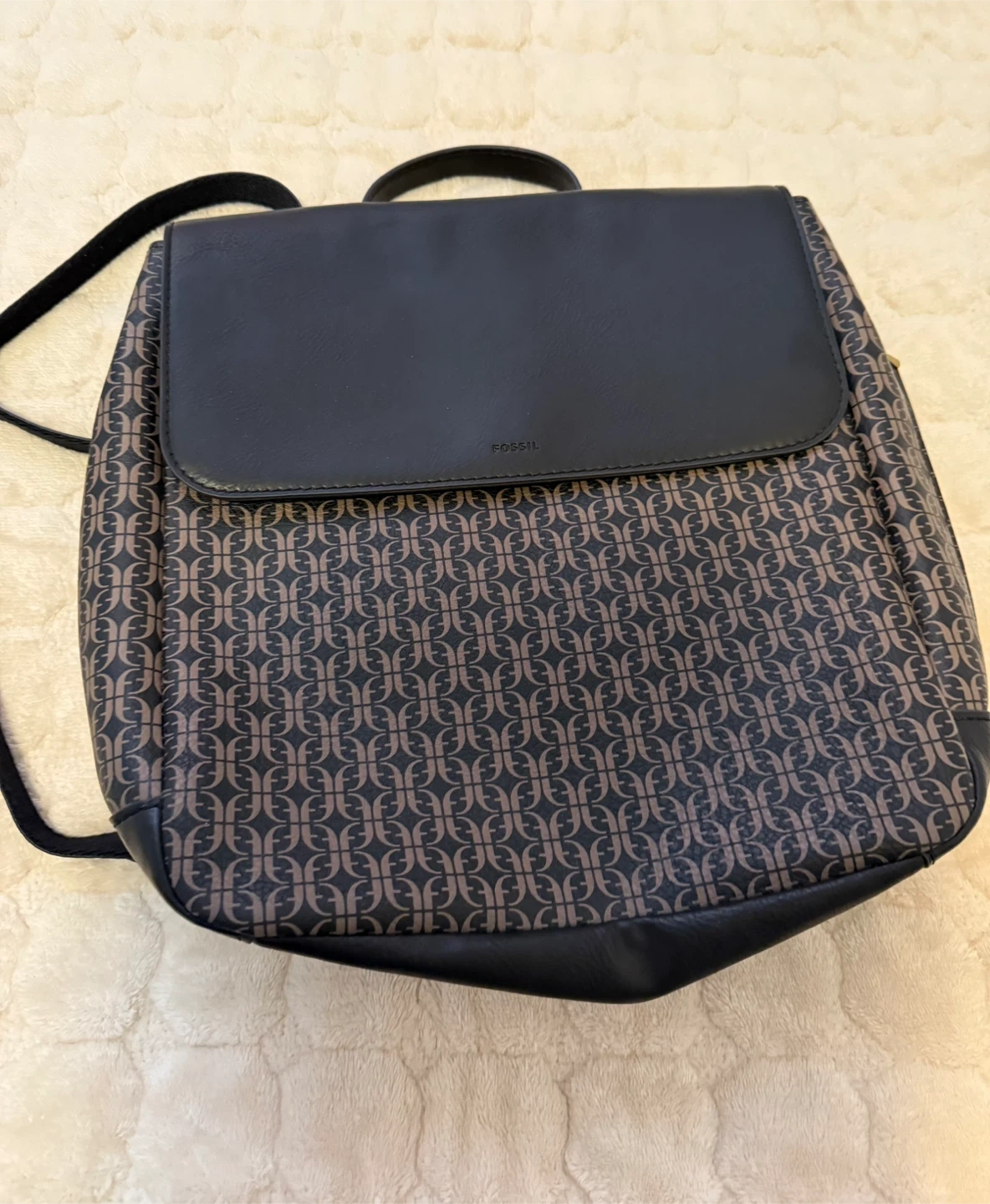This is a Fossil backpack with a black and brown pattern. It's in great condition. Never used.