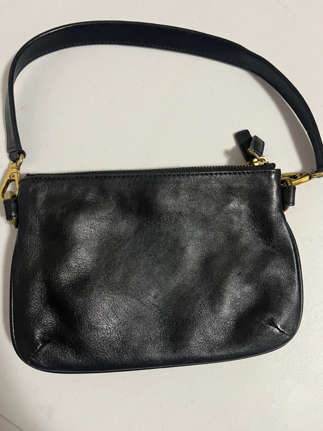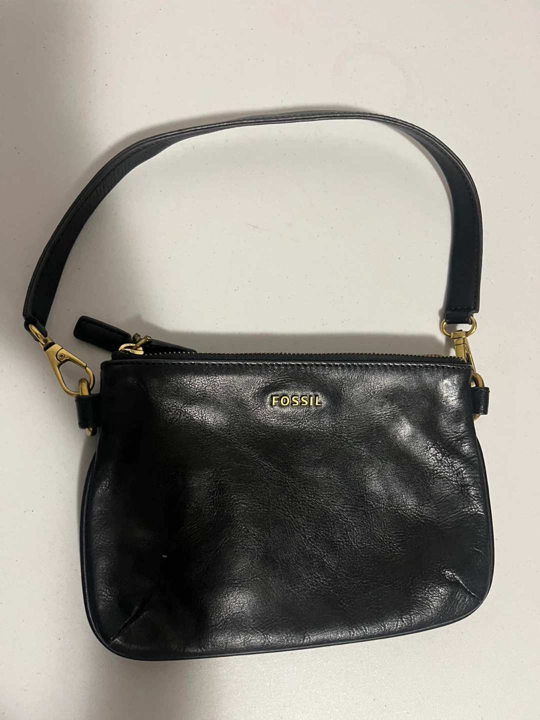98Selling a Fossil handbag in black leather! It's a stylish and practical accessory. The bag features a convenient shoulder strap and a zippered closure. Perfect for carrying your essentials in style