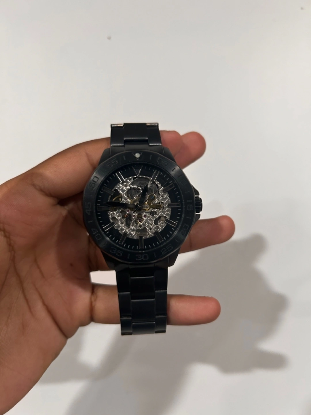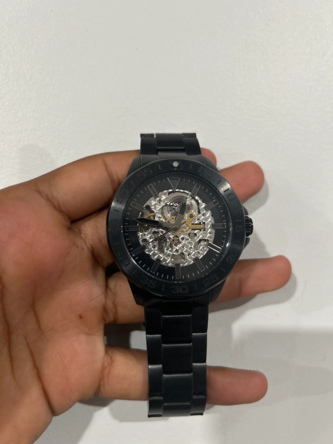 Looking to sell my black Fossil automatic watch. It's in great condition and has a really cool see-through design on the face! The stainless steel gives it a sleek look, perfect for everyday wear or dressing up