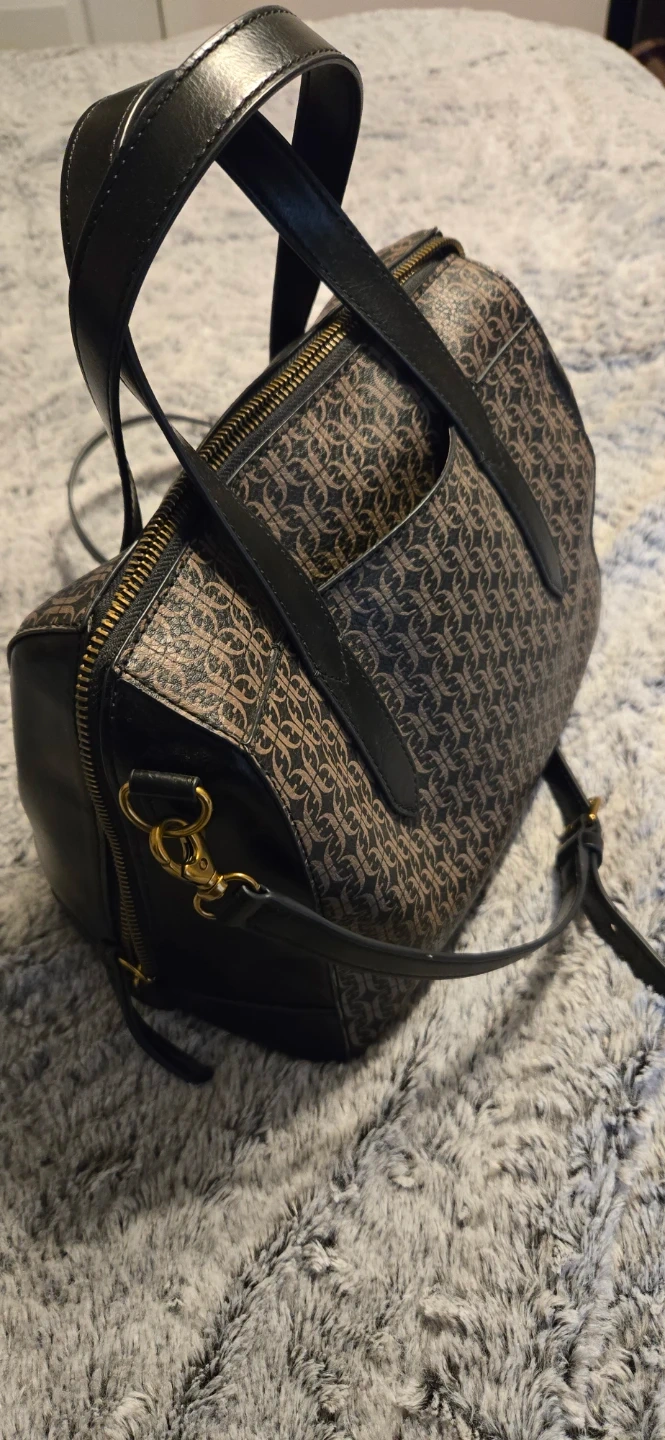 125Here's a stylish Fossil barrel bag that I'm hoping to pass on to someone who will love it! It features a unique brown patterned design with black leather accents and gold-tone hardware. It's in great condition and ready for a new home
