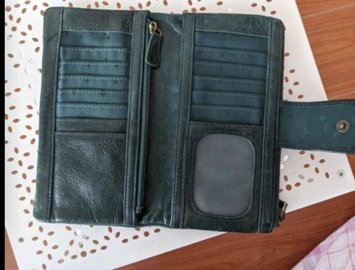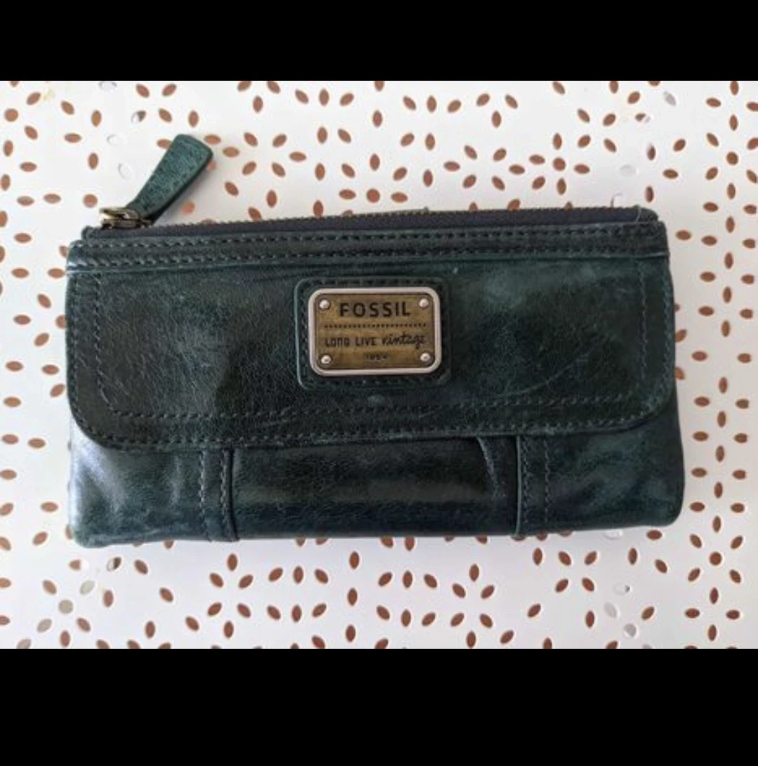 Green Fossil Emory Clutch in great condition. Genuine leather. 12 card slots 1 bill compartment 1 ID compartment 1 zipper compartment Dims: 19 cm (L) x 2.5 cm (W) x 10 cm (H