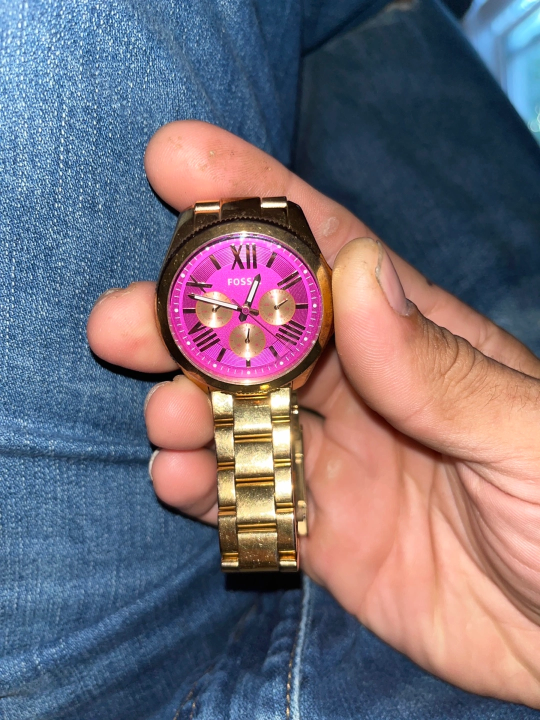 Selling a Fossil watch with a gold band and a striking pink face! It's a stylish piece that's sure to catch the eye. Perfect for adding a pop of colour to any outfit