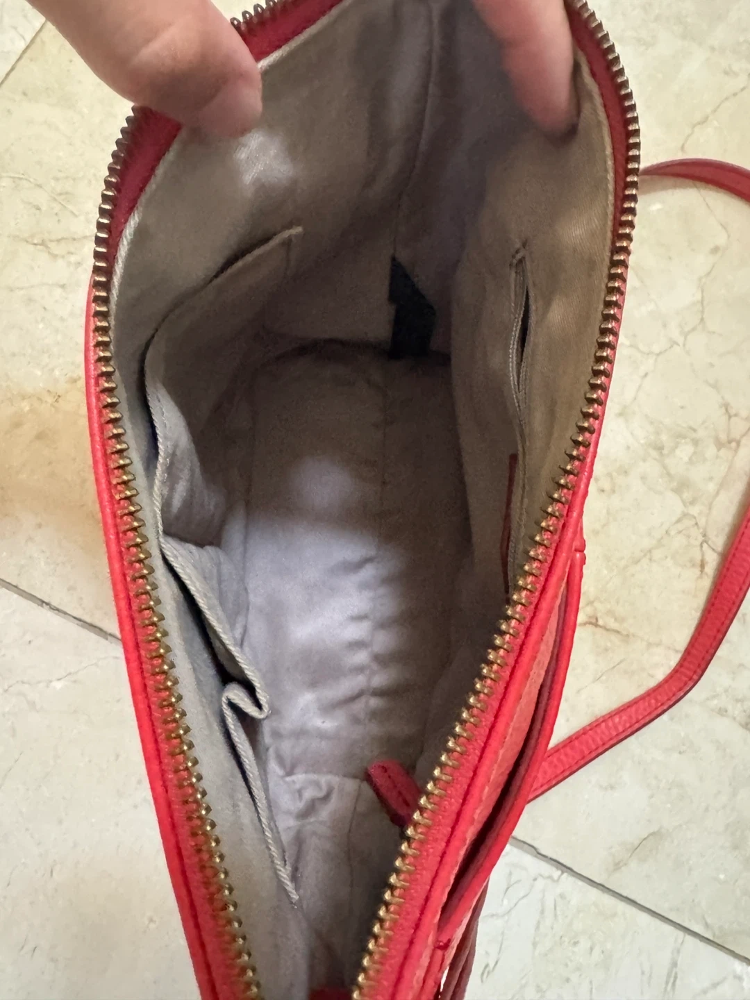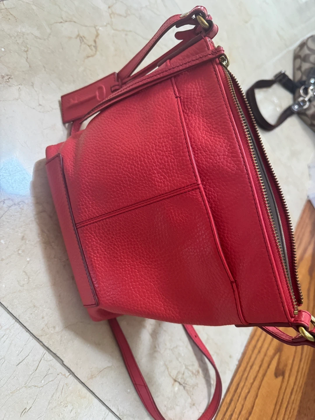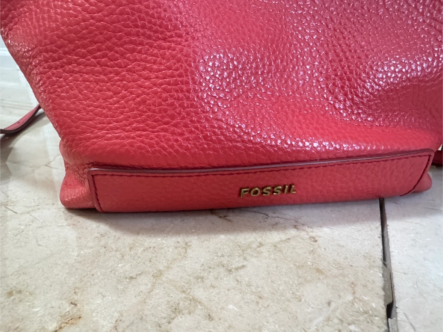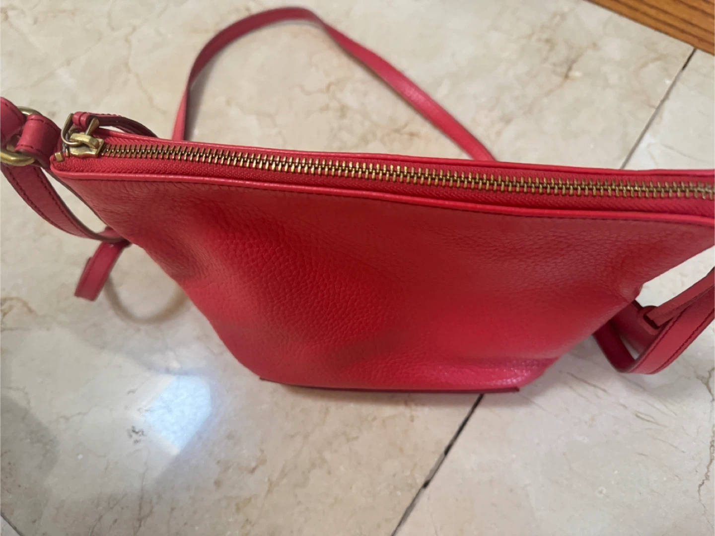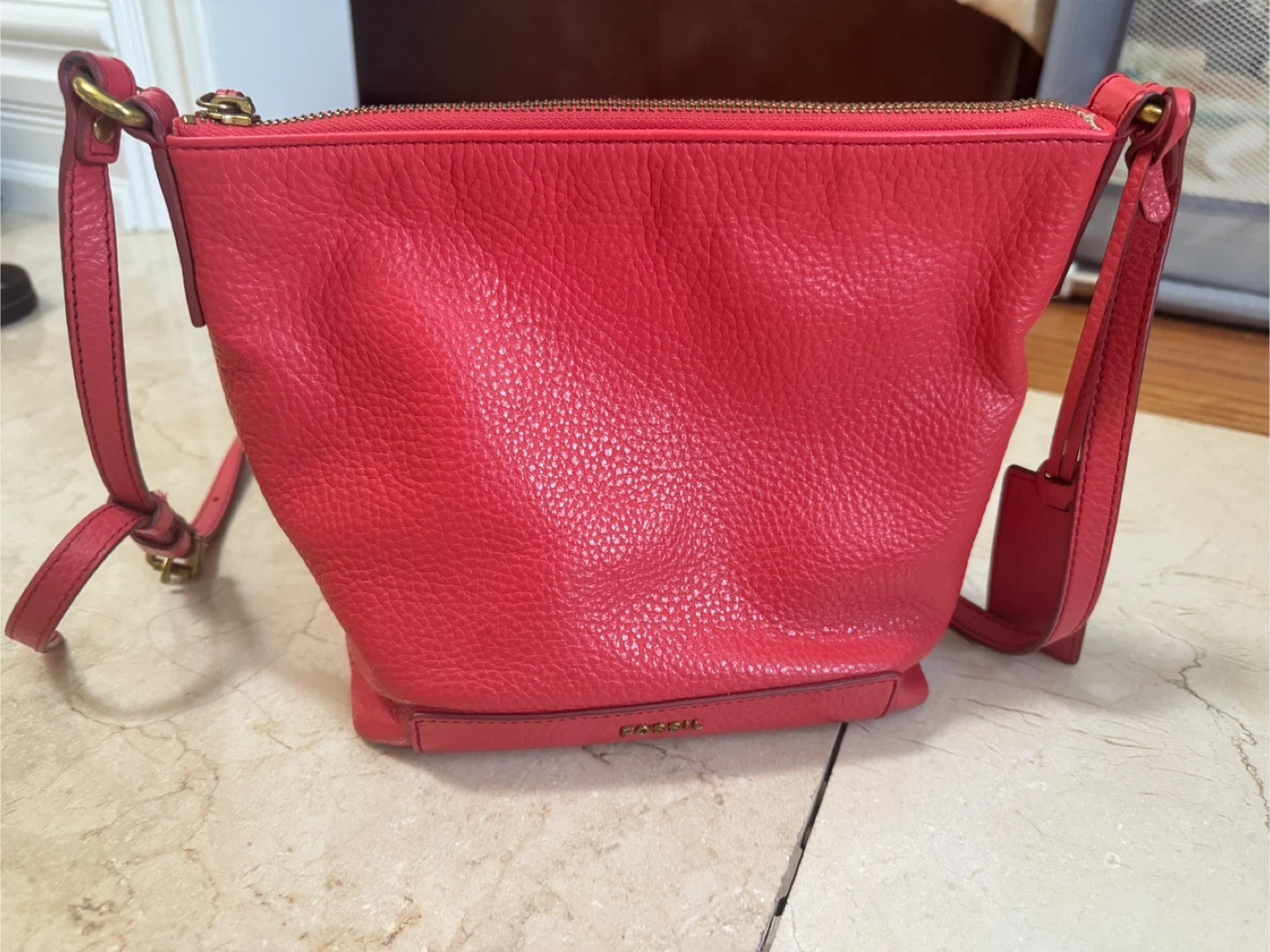 Selling a cute Fossil crossbody bag in red leather! It's in great condition and perfect for everyday use. The bag features a zipper closure and a long strap for comfortable wear. The interior is lined and has a few pockets to keep your belongings organized