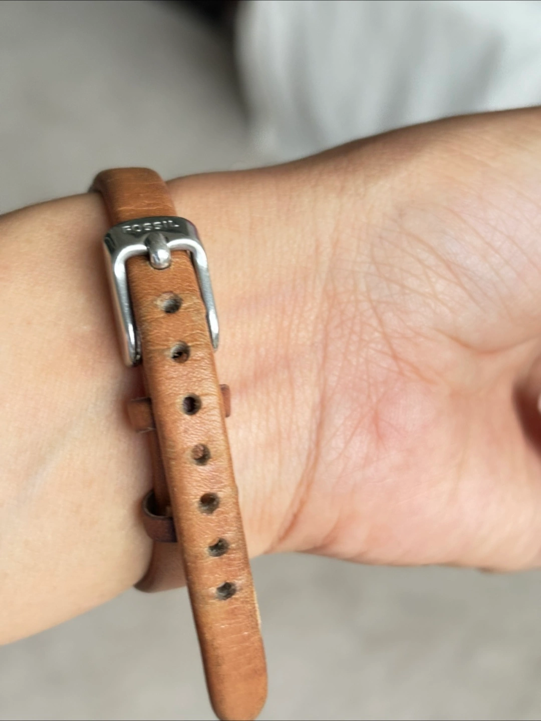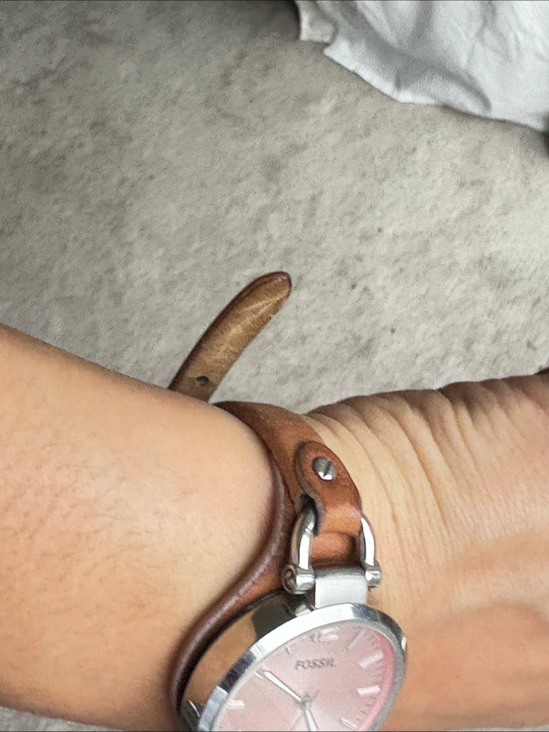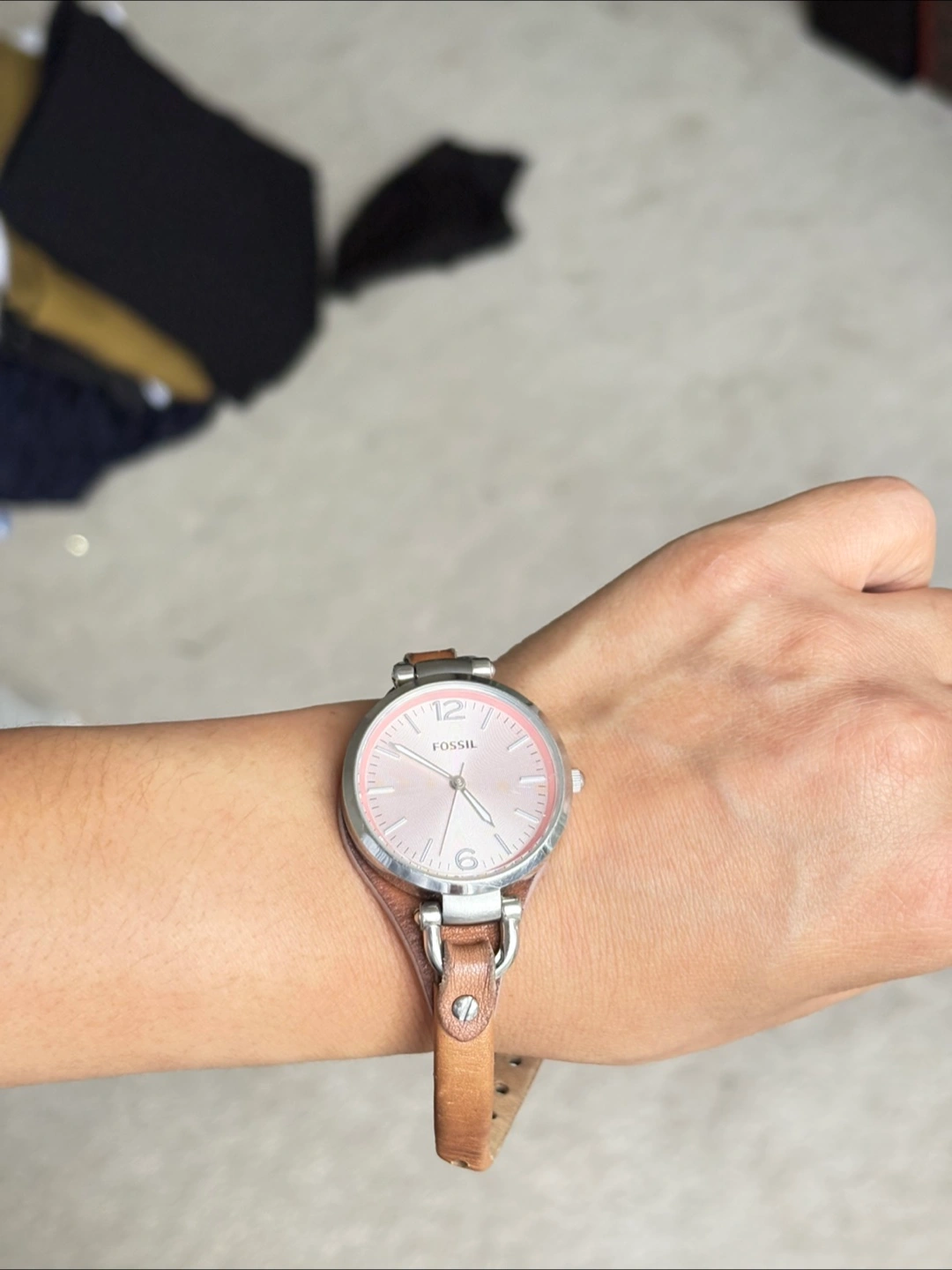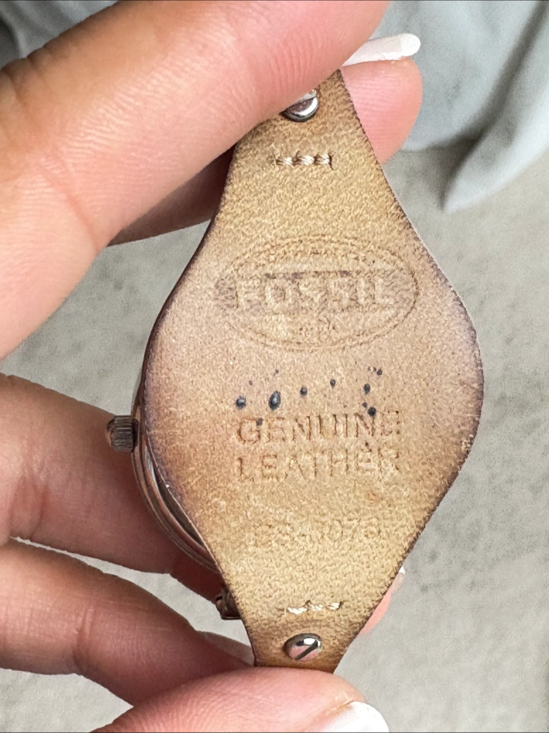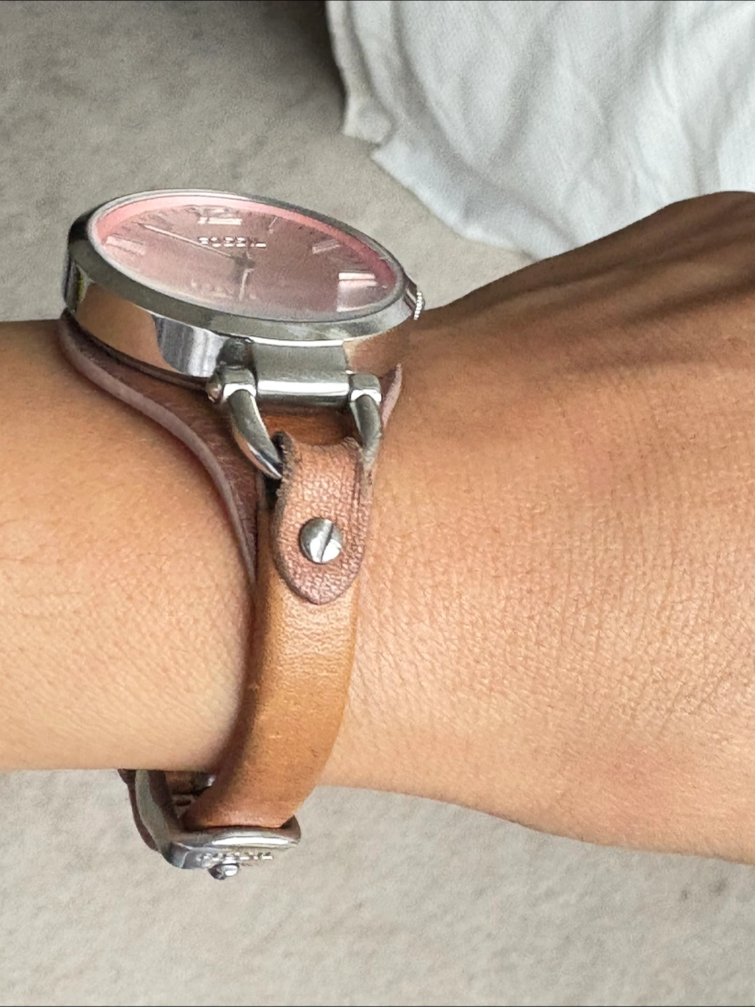 Selling a Fossil women's watch with a genuine leather band. It has a pink face and a silver casing. The band shows some wear, but the watch itself is in good condition!
