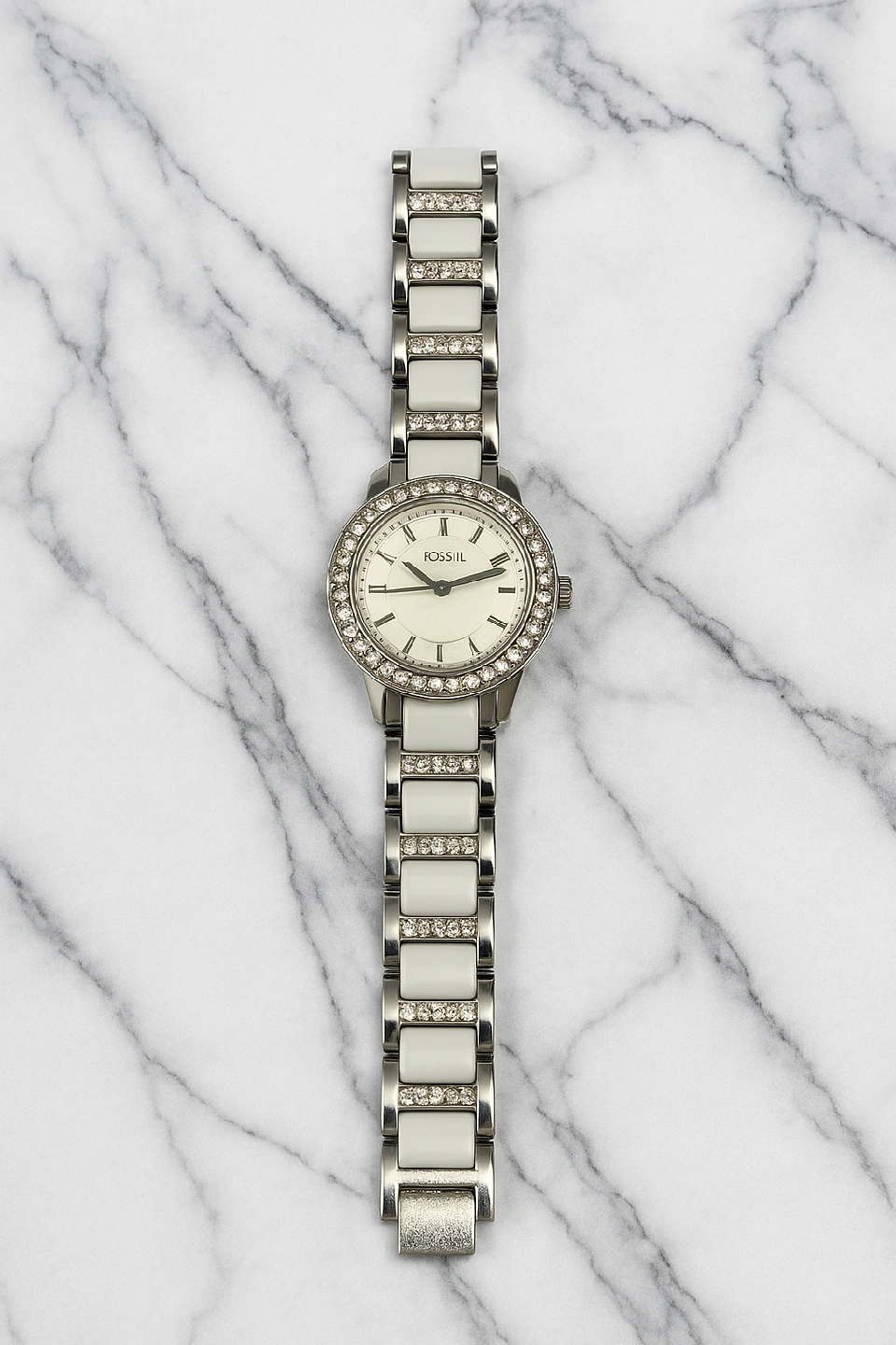 15Selling a beautiful Fossil women's watch with a white ceramic bracelet. The watch face is surrounded by sparkling stones, adding a touch of elegance. It's in great condition and ready to wear!