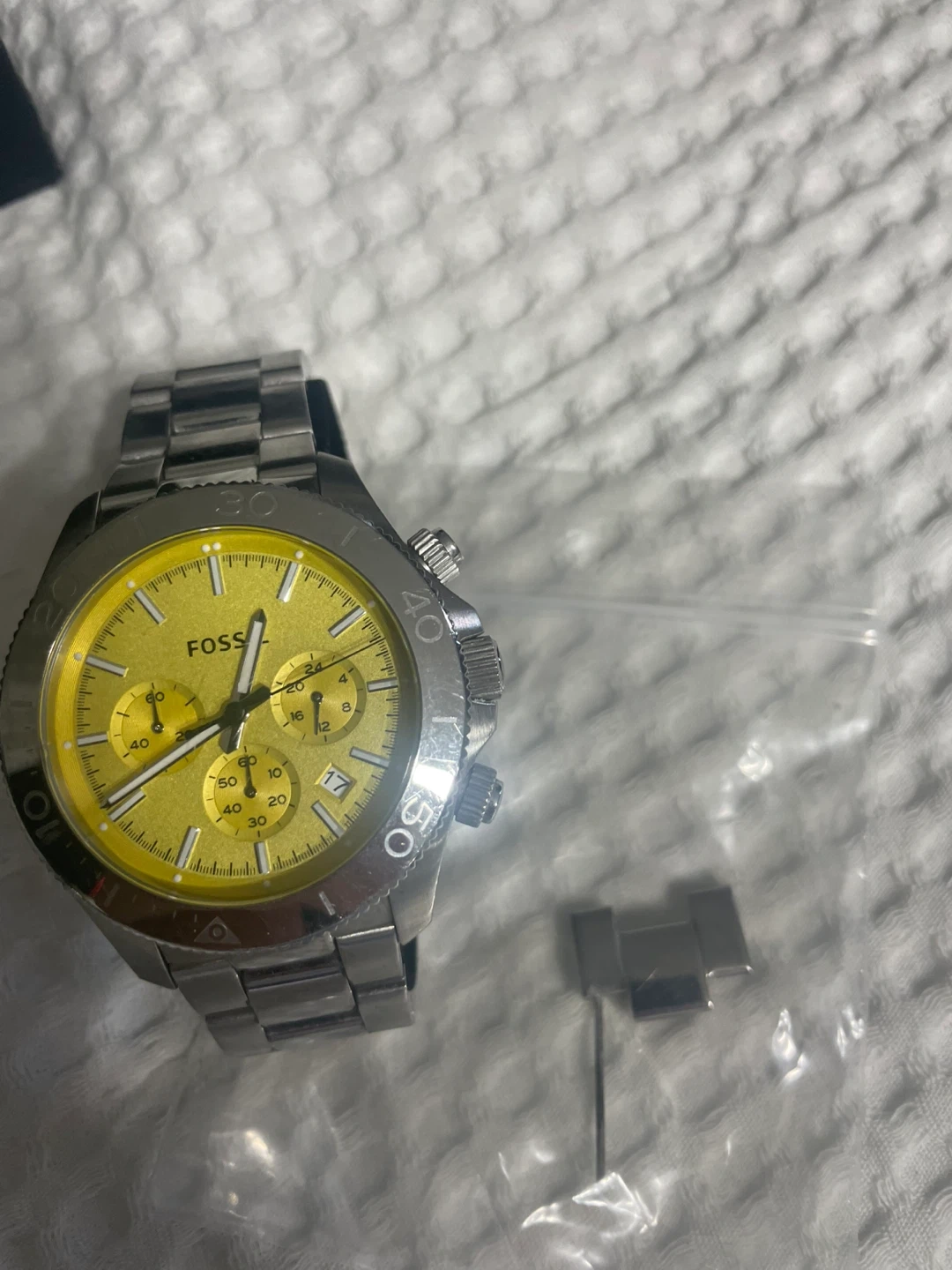 Selling a Fossil watch with a vibrant yellow dial and stainless steel band. It's in great shape and ready to wear! Comes with an extra link for the band
