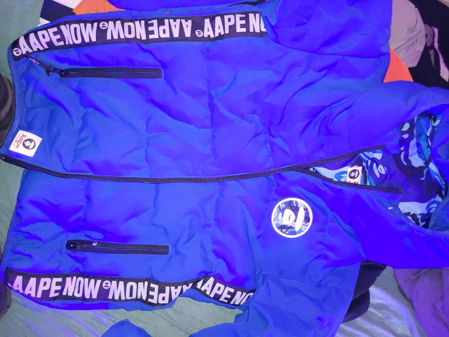 Check out this Aape by A Bathing Ape puffer jacket! It features a cool blue camo design and is a size L. Perfect for staying warm and stylish!