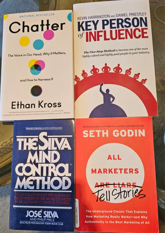 Selling a set of four books: - Chatter by Ethan Kross - Key Person of Influence by Kevin Harrington and Daniel Priestley - The Silva Mind Control Method by José Silva and Philip Miele - All Marketers Are Liars by Seth Godin