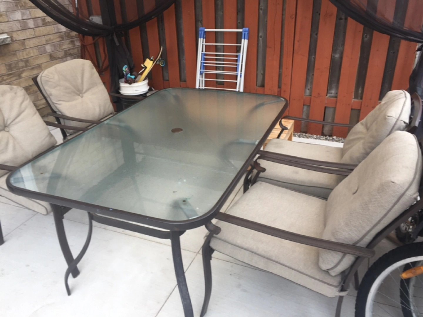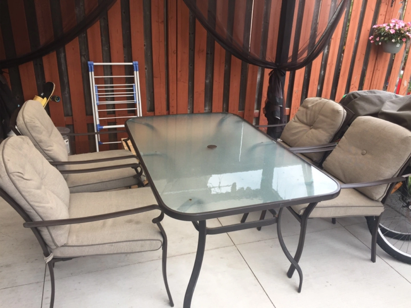 5Four chairs with Beige cushions. Good for small spaces. Some wear and tear. Table (SOLD)