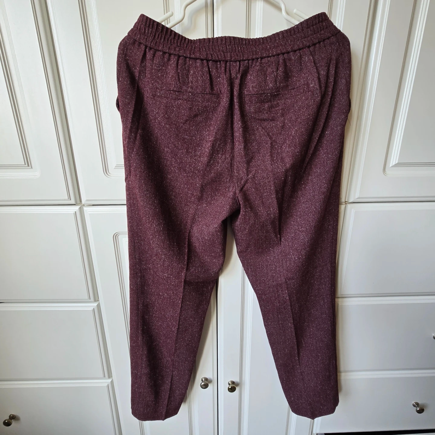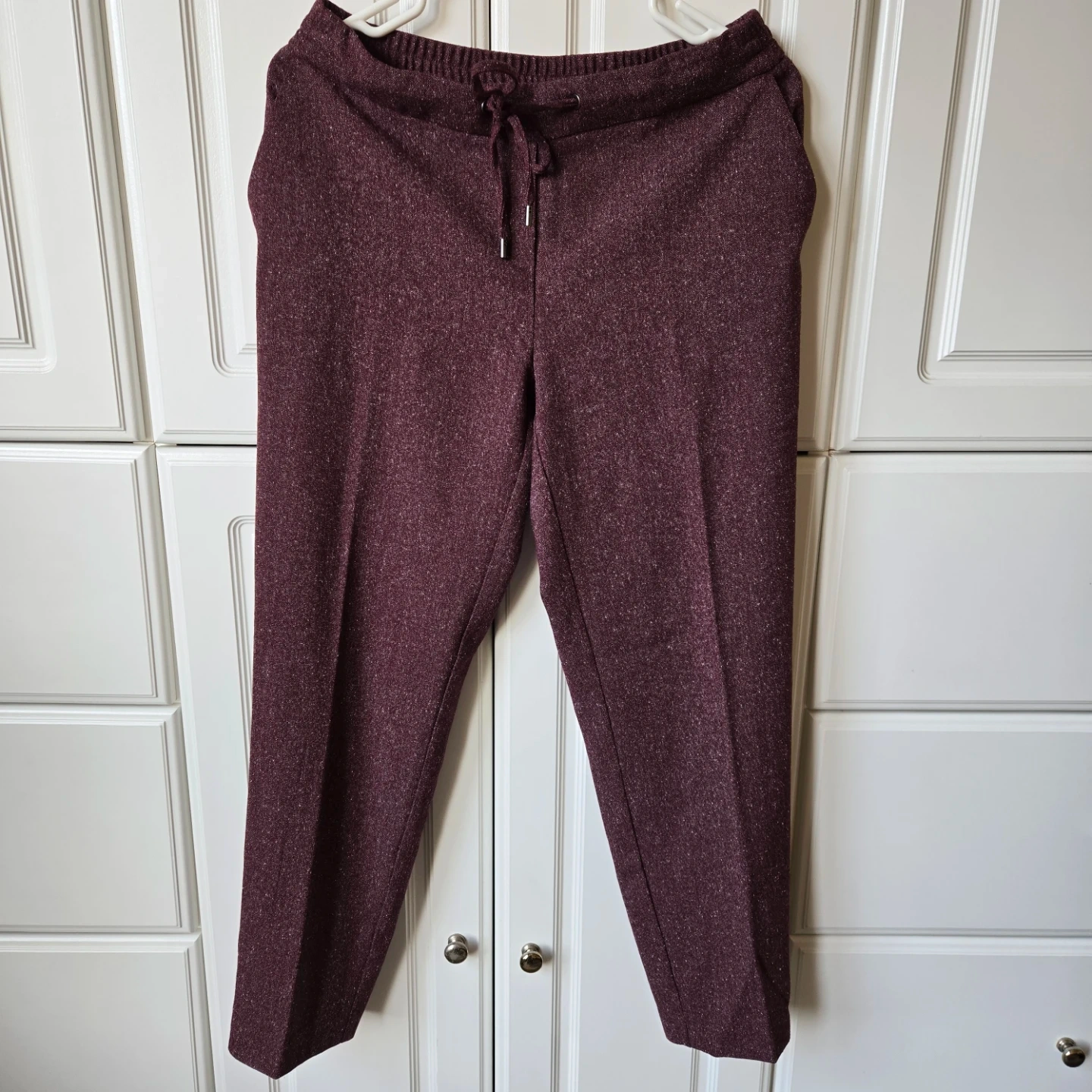 These Reitmans pants are burgundy with a tweed-like pattern. They're a petite size 4 and made from 76% polyester, 23% viscose, and 1% elastane. They feature an elastic waistband with a drawstring and pockets. Super comfy!