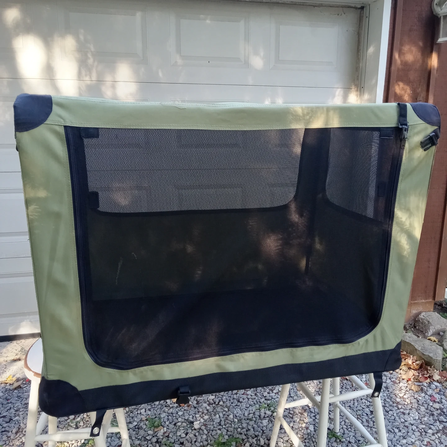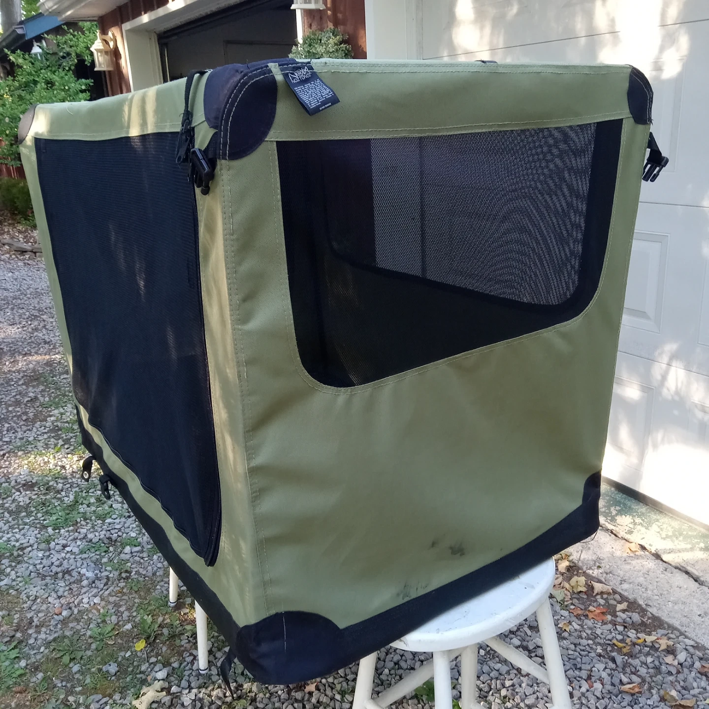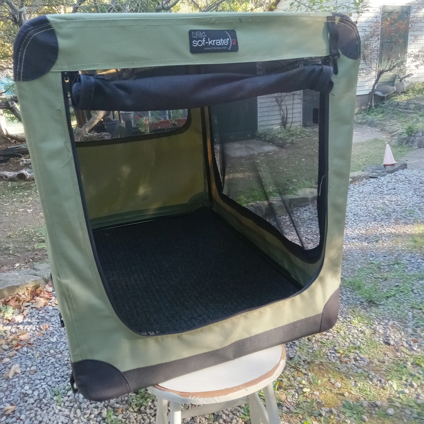 This is a Noztonoz Sof-Krate 2 pet carrier. It's made of durable fabric with mesh windows for ventilation. The crate folds flat for easy storage and transport.