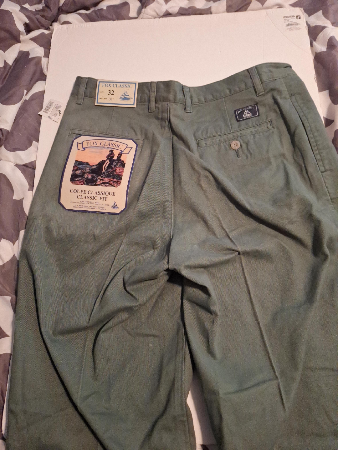 60Selling a pair of Fox Classic pants in olive green. They are size 32 with a 30-inch inseam. These pants have a classic fit and are in good condition. Perfect for a casual or dressed-up look!