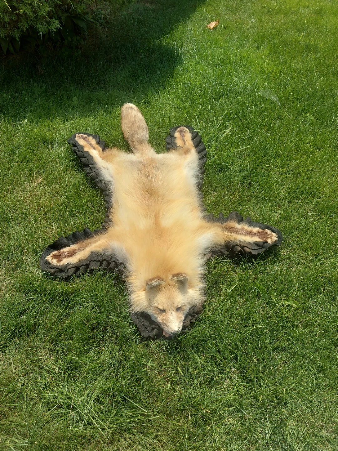 60This is a fox pelt rug. It is lying on the grass.