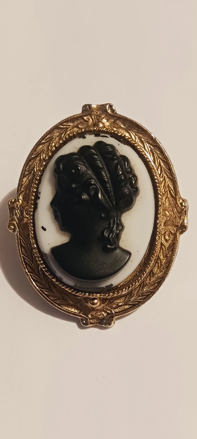 This vintage cameo brooch features a classic profile silhouette in black on a white background. It's set in an ornate gold-tone metal frame.. It's a lovely accessory for adding a touch of vintage charm to an outfit! 2"×1.5". Excellent condition. ALL MY PRICES ARE NEGOTIABLE !!