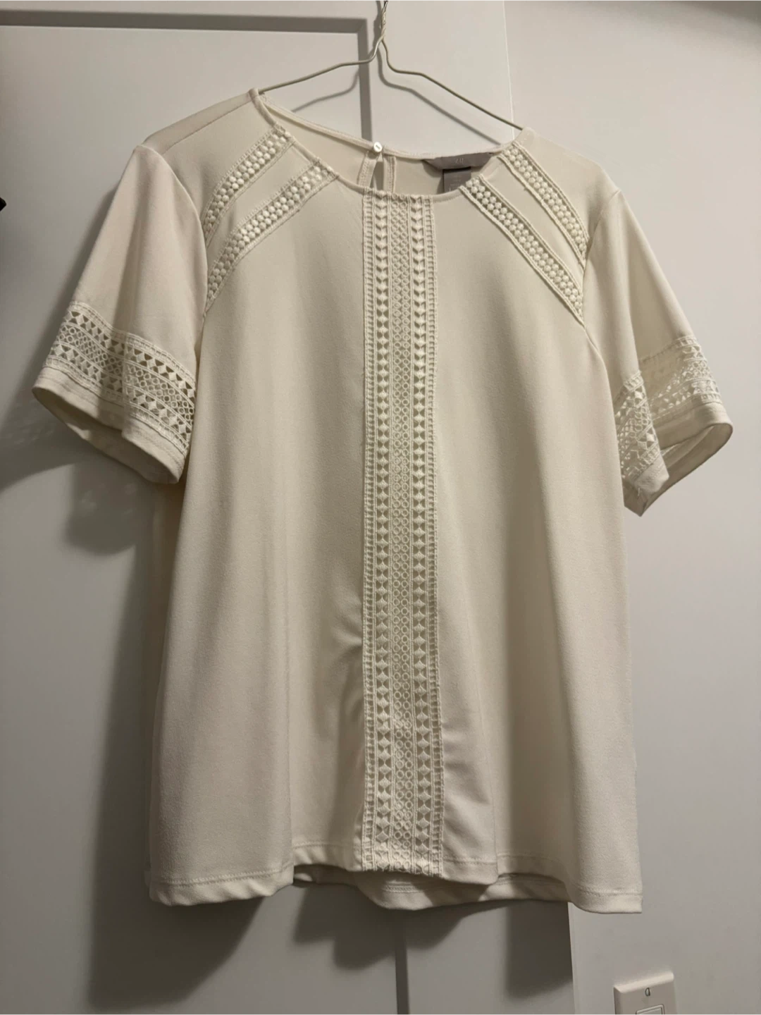 Selling a cute loose fitting H&M blouse in cream colour! It's a size small and features lovely lace detailing on the sleeves and front. Perfect for a casual or dressy look!