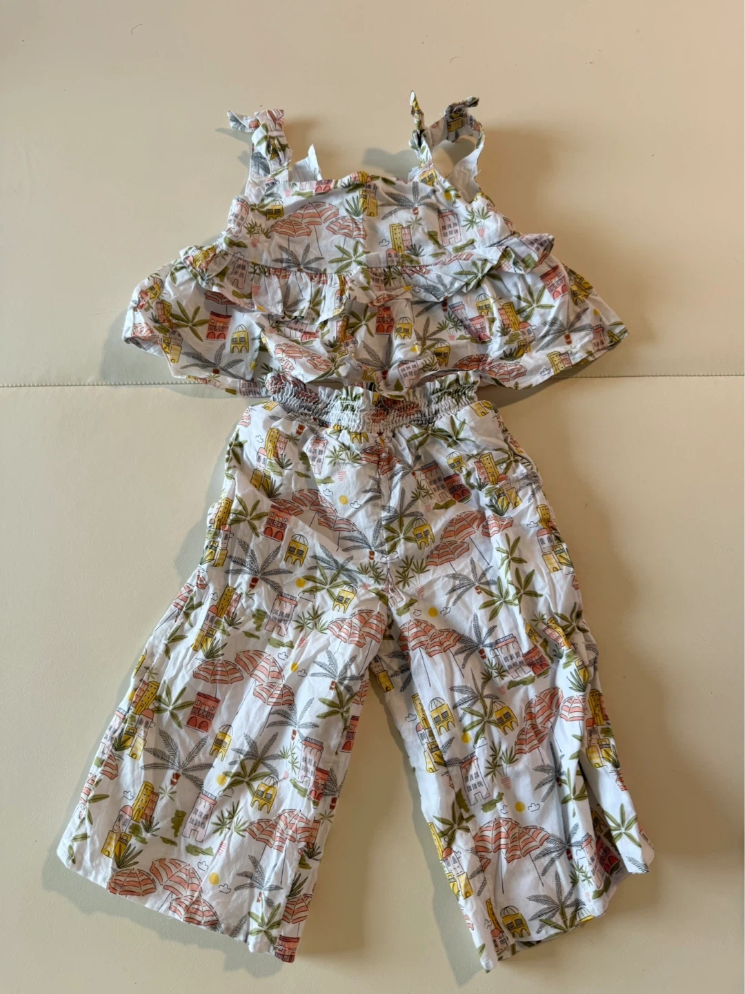 Cute white set for kids featuring a tropical print with buildings, palm trees, and umbrellas. The top has ruffles and tie straps. The pants are wide-leg with an elastic waistband. Perfect for warm weather fun!