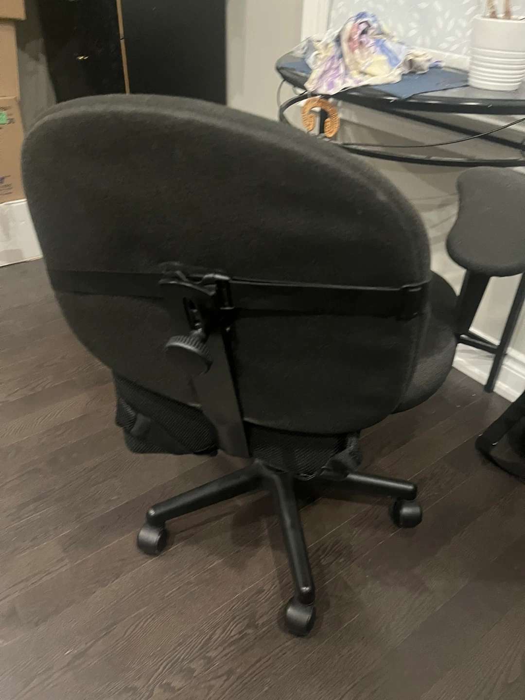 This black office chair offers adjustable lumbar support for comfort. It has a sturdy base with wheels for easy mobility. It's suitable for extended use at a desk.
