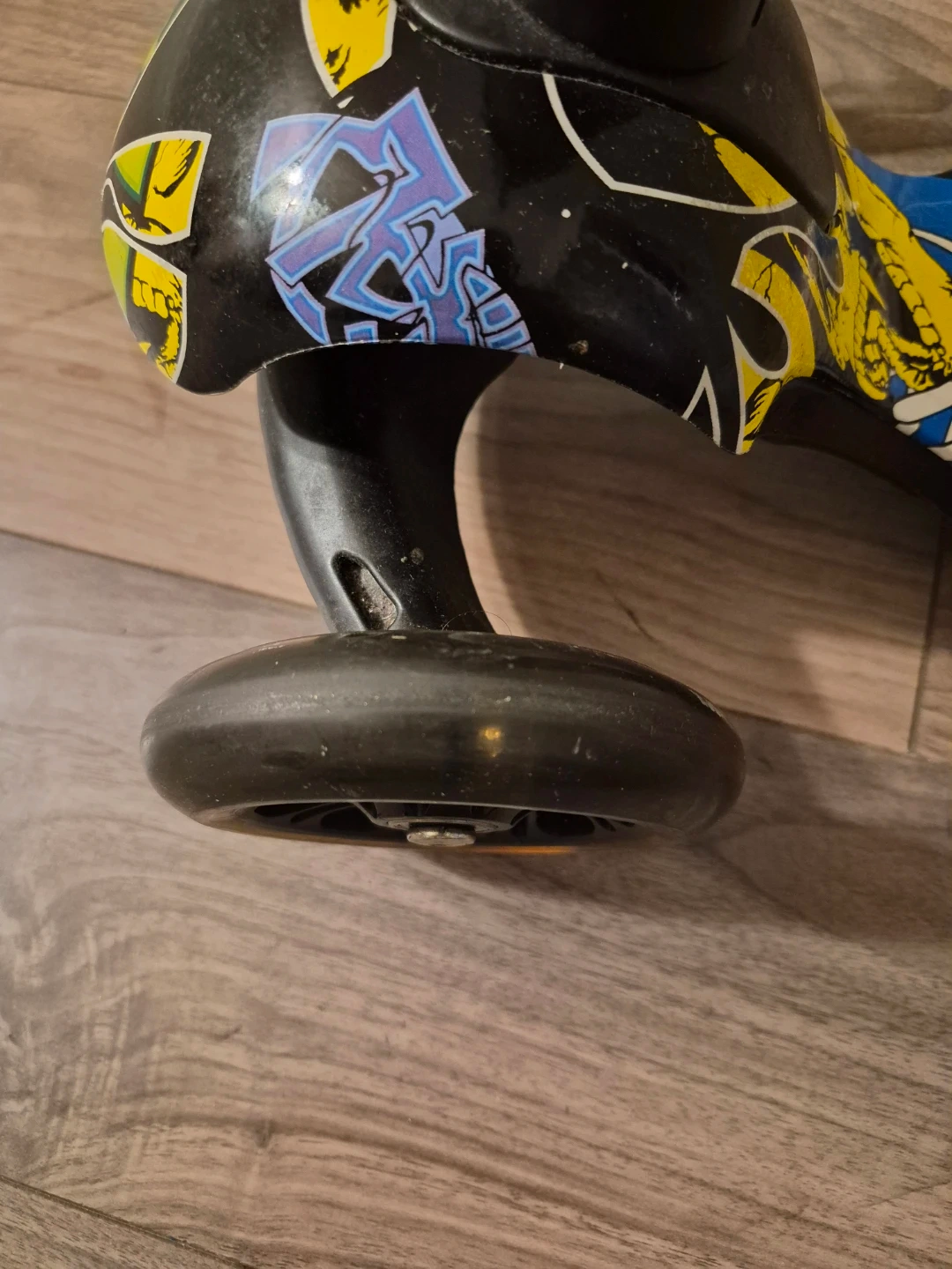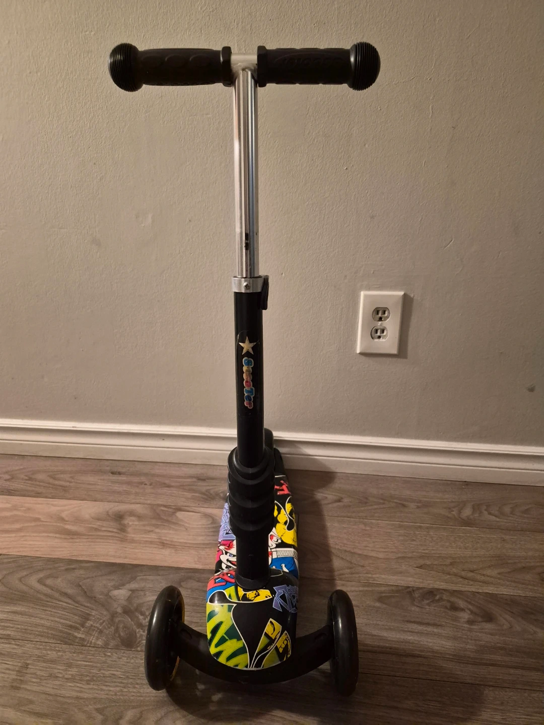 This three-wheel scooter features a fun graffiti-style design. It has a sturdy metal handlebar and black rubber grips for a comfortable hold. The deck is wide enough for stability. It's a great way for kids to get around and have some fun outdoors!