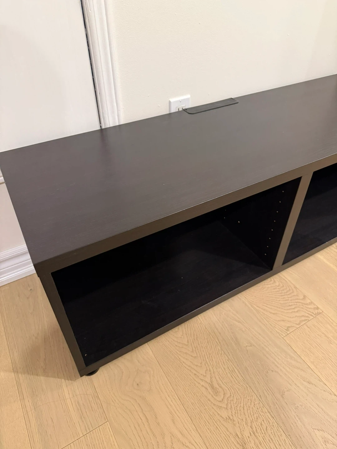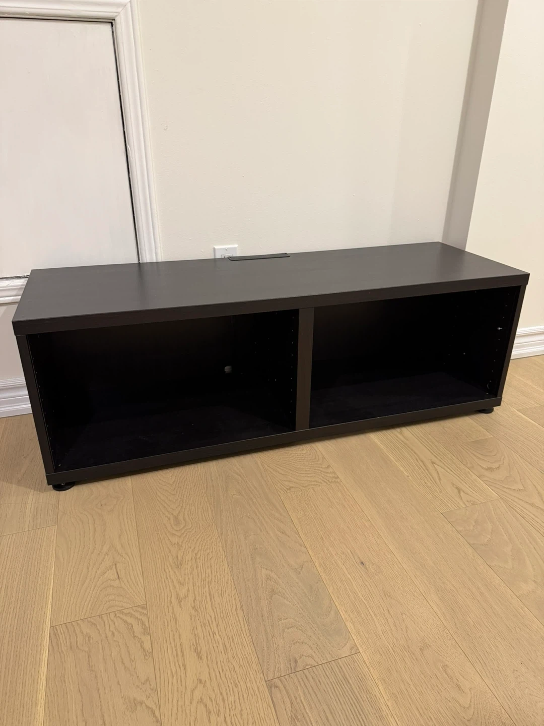 Selling a dark brown TV stand or media console. It's in great shape and ready for a new home! It features two open compartments for easy storage and display