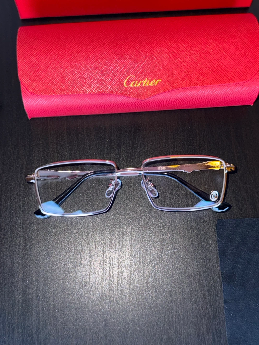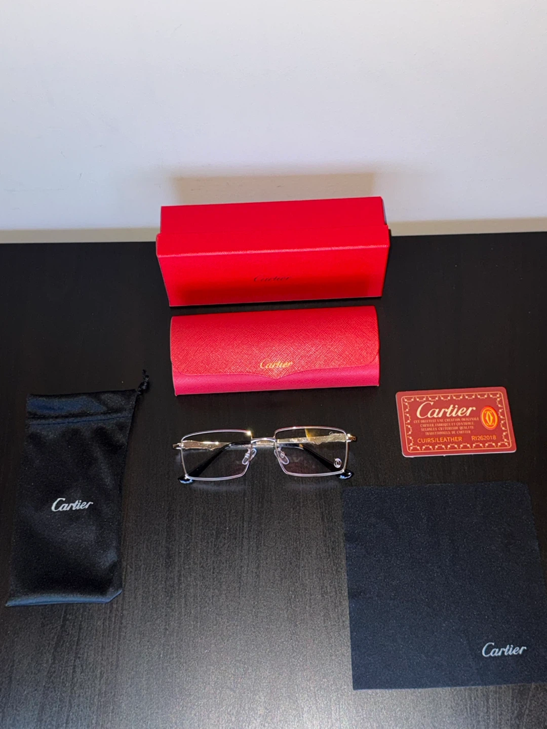 These are Cartier eyeglasses. They come with the original red case, box, cleaning cloth, and a pouch. The frames are silver and gold coloured with blue accents on the earpieces. Includes authenticity card.