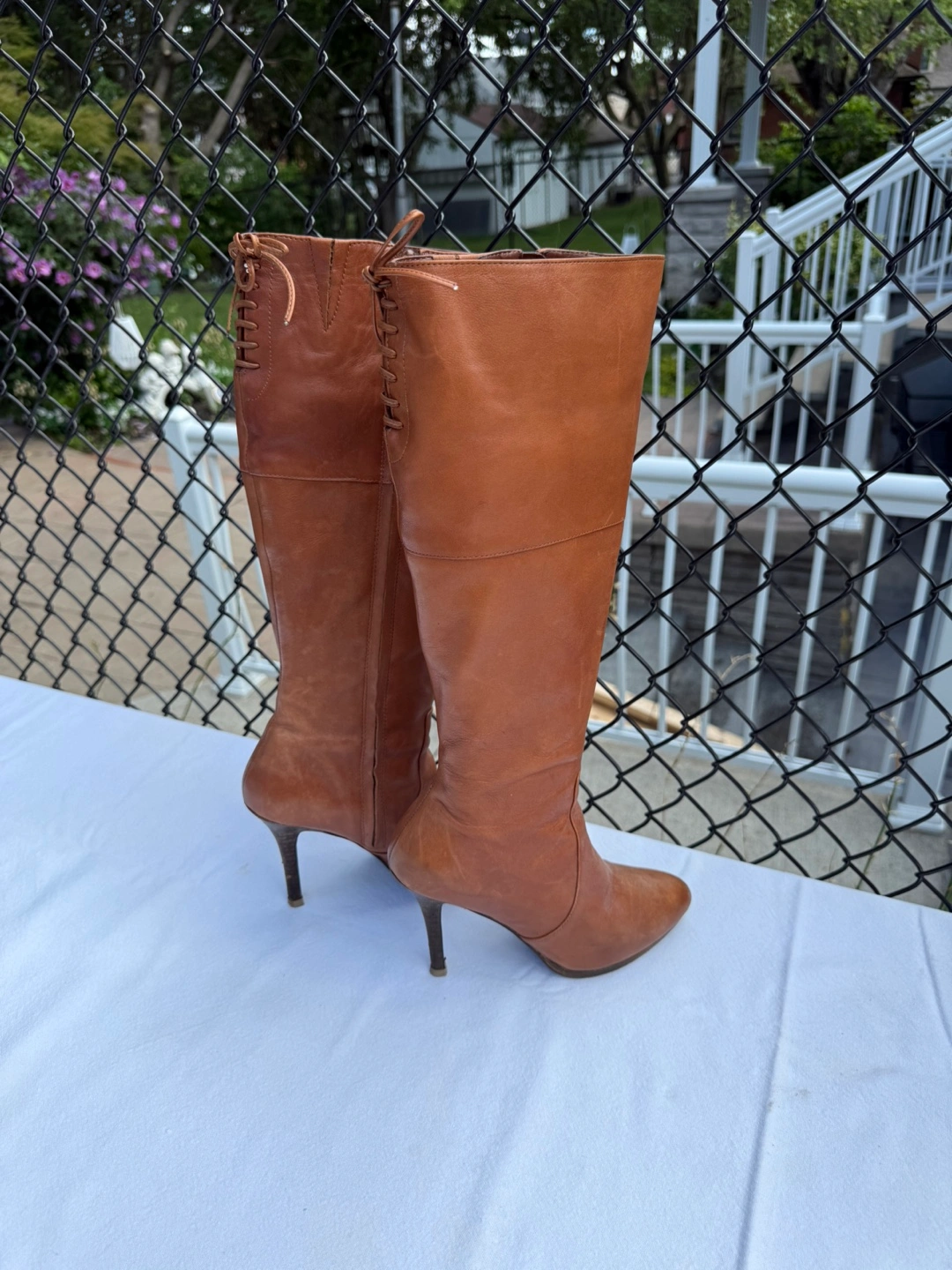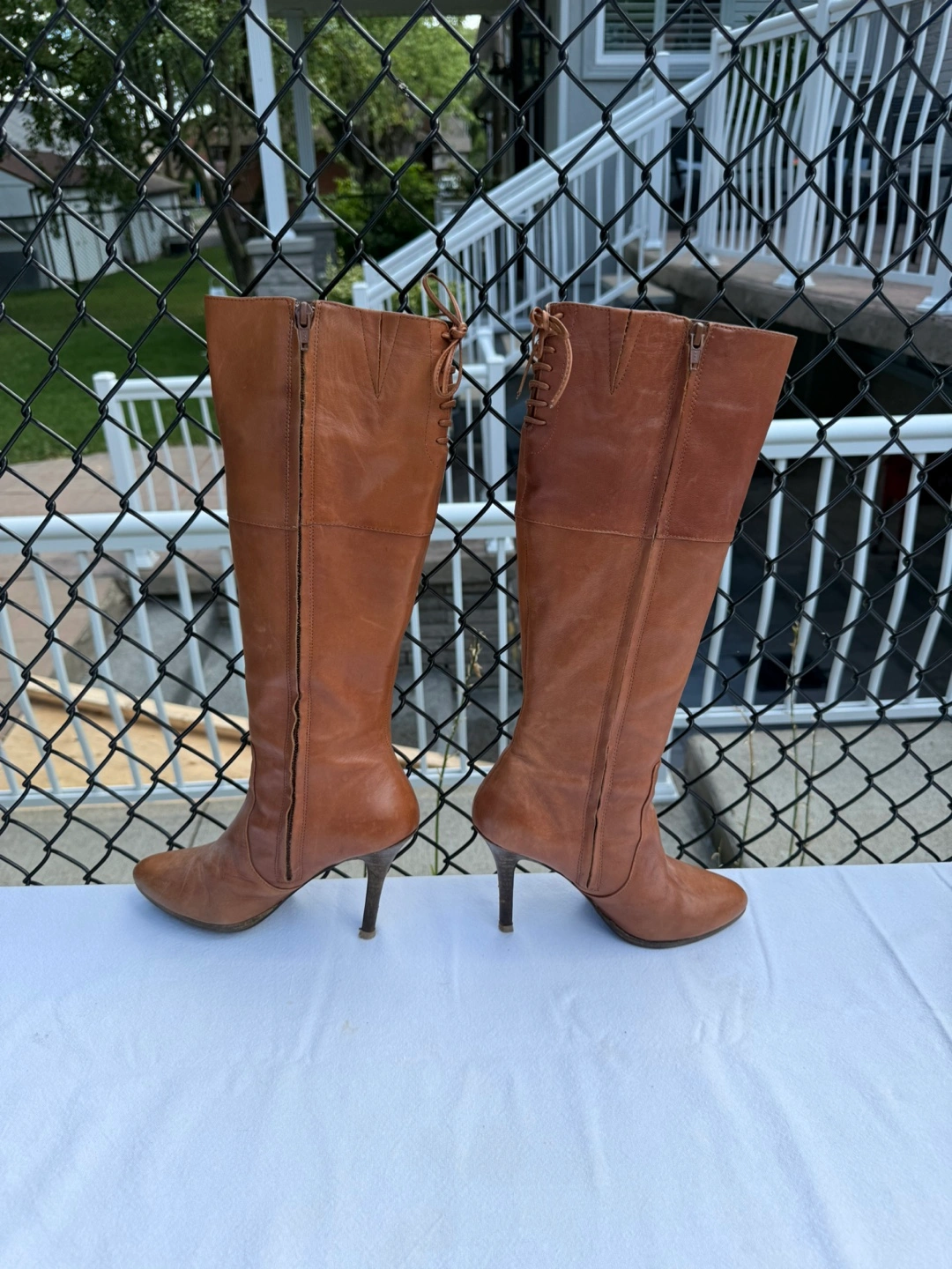 These are a stylish pair of knee-high boots in a beautiful tan leather. They're a women's size 6 and have a comfortable heel height for a night out or a special event. They're in good condition and ready for a new home!