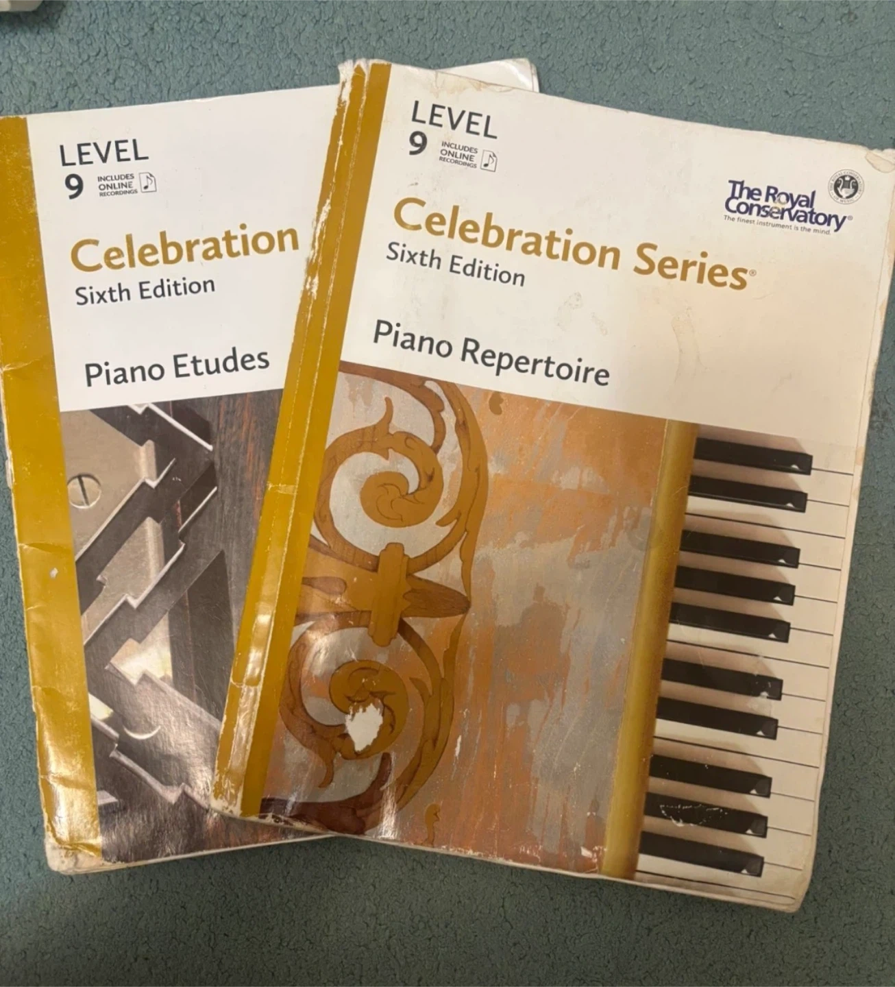 Two books from The Royal Conservatory Celebration Series, Level 9, Sixth Edition. Includes 'Piano Etudes' and 'Piano Repertoire'. Both books are in good condition and originally bought for around $100.