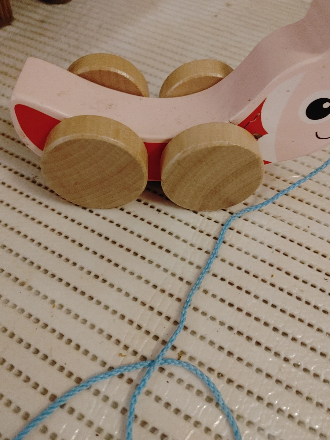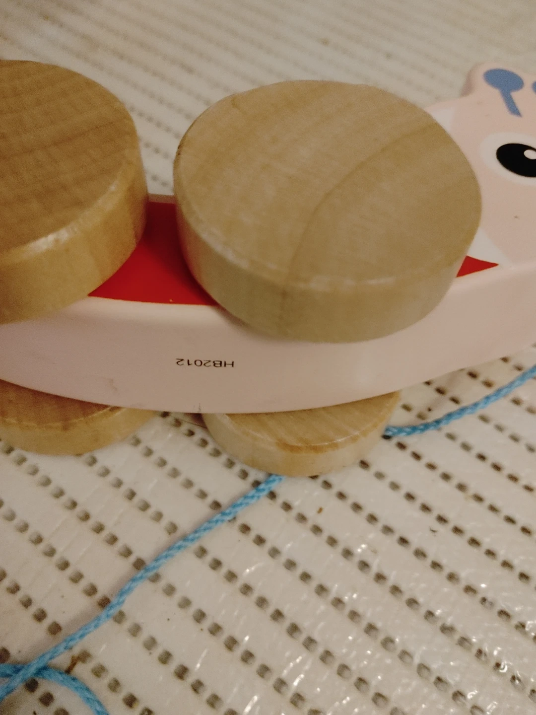 This is a cute wooden snail pull toy. It's made of wood and has a blue string for pulling. It's suitable for toddlers and young children.small paint chip /missing pull knob