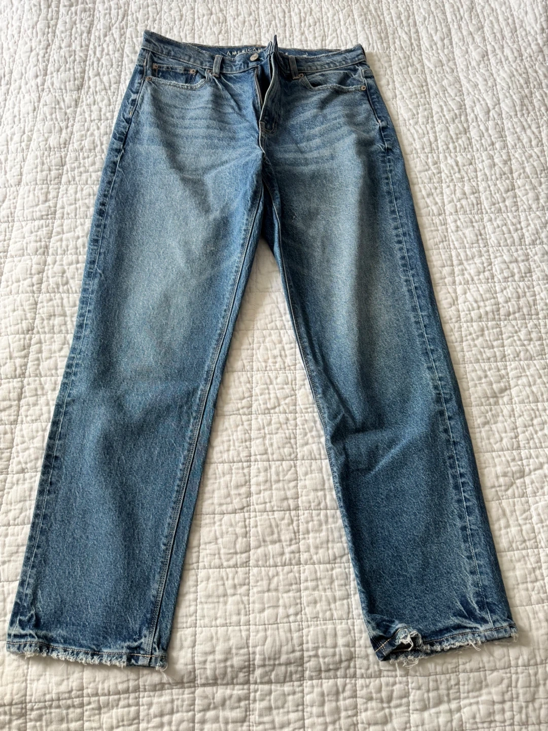 These are American Eagle jeans in a medium blue wash. They're made with stretch denim for comfort. Distressed hem detail. The mom jean