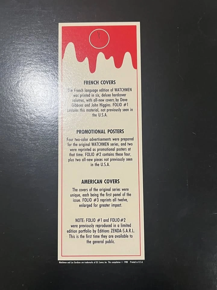 This is a great Watchmen portfolio art set, with American, French, and Promotional posters. Perfect for Alan Moore and Watchmen fans. Too many posters to show on marketplace. You can find this online and see what is included.