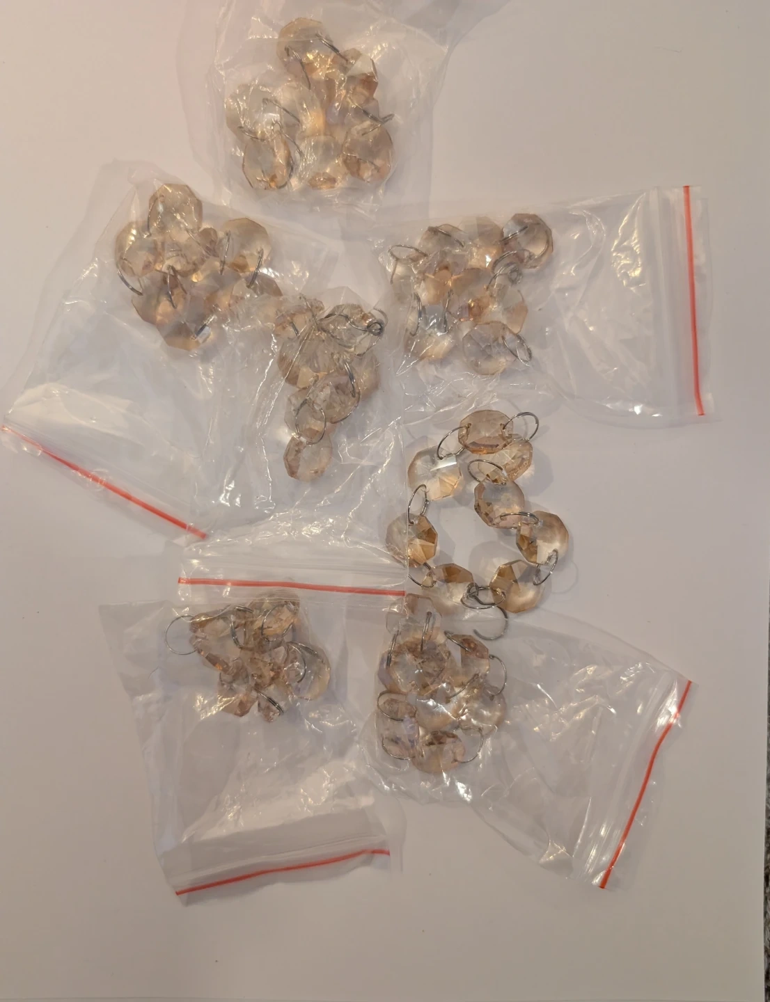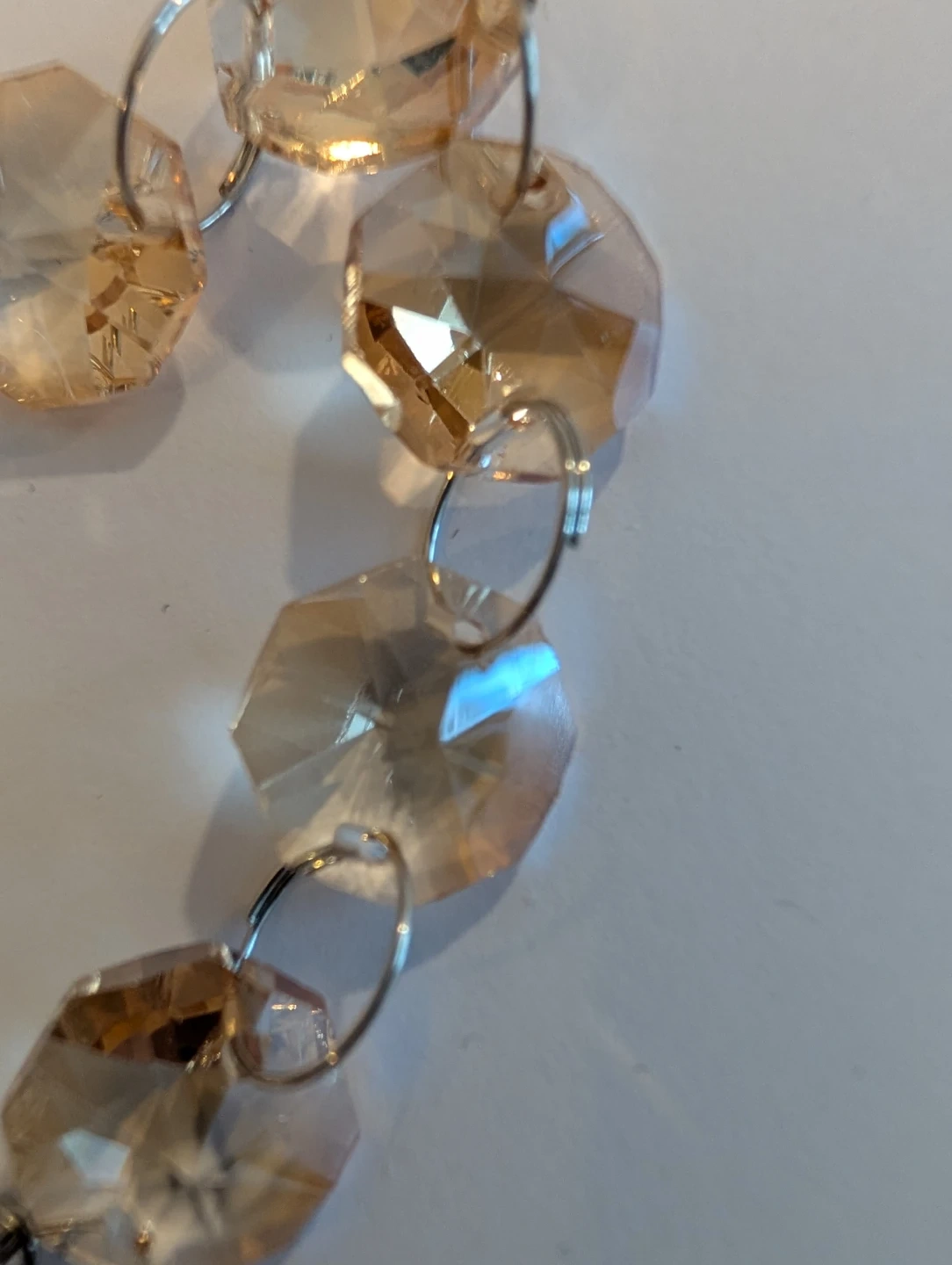 This set includes ten strands of sparkling crystal chandelier pendants. Each strand is made of faceted clear champagne-coloured beads linked with silver-toned metal rings. They've got a hook on one end for easy hanging. Great for adjusting the length to make your own jewelry like brecelets, earings or necklaces.